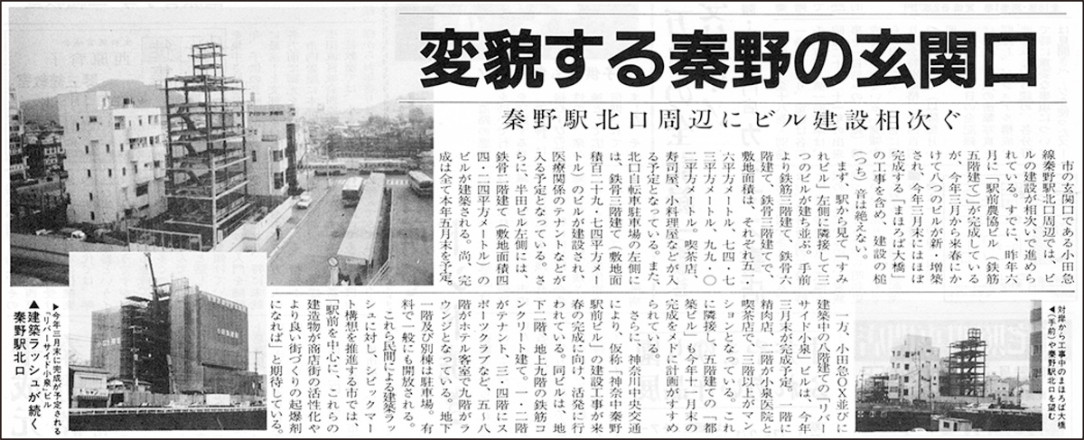 当時のタウンニュース秦野版によると、前年に完成した「駅前農協ビル」をはじめ、この年に8つのビルが新・増築予定と報道されている。民間によるビルの建設ラッシュに対し、市は「駅前を中心に、これらの建造物が商店街の活性化やより良い街づくりの起爆剤になれば」と期待を寄せており、大きく変化した年であったことがわかる。