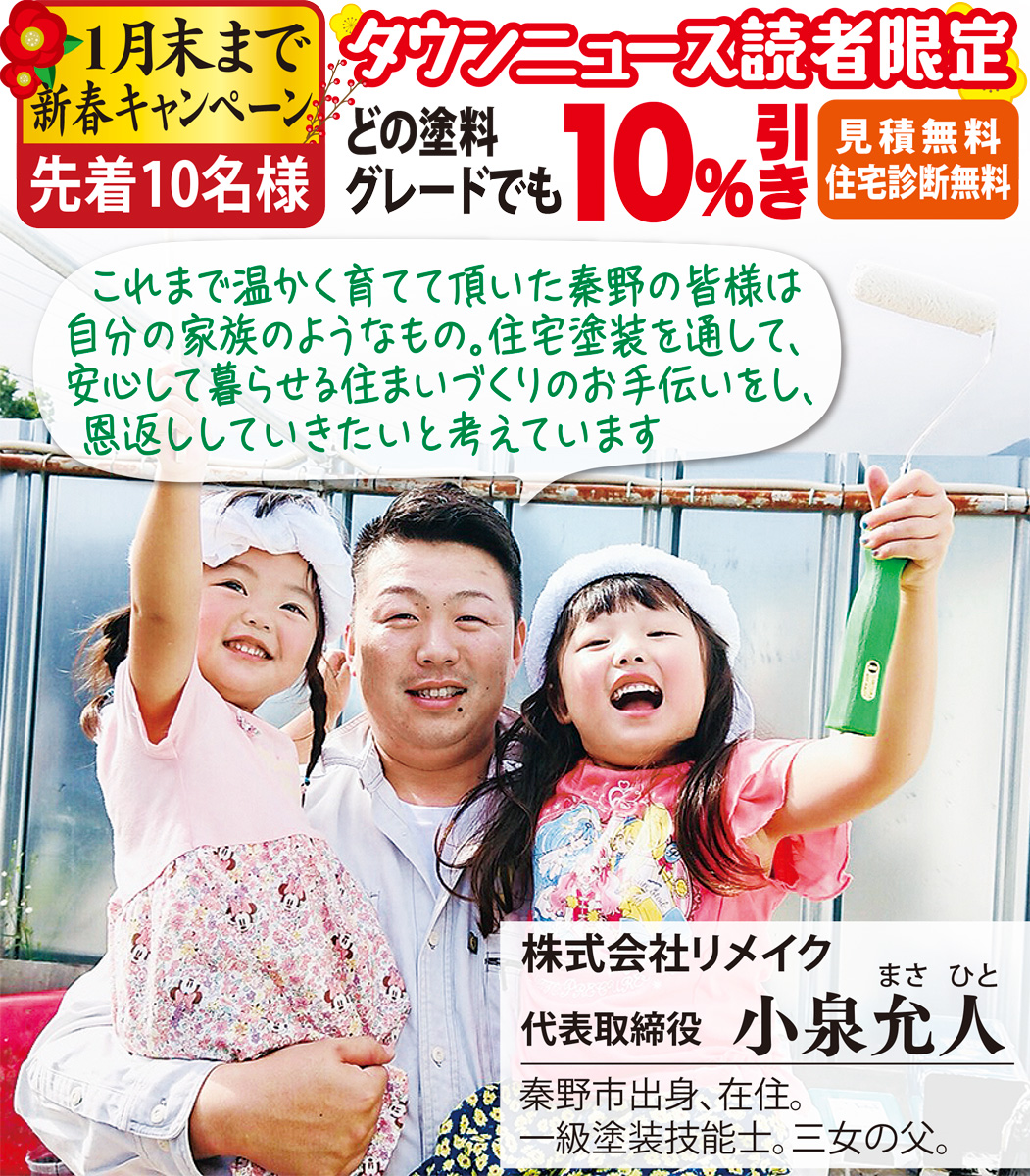 地元秦野を愛するからこそ「悪どい業者は絶対に許せない」という小泉允人(まさひと)社長(一級塗装技能士)が、地域密着で屋根や外壁の塗装・防水工事を手掛ける職人会社、(株)リメイク。塗装の専門店AZABUの加盟店で、質の高い工事が口コミなどで広がり、施工実績は4千棟を突破した。