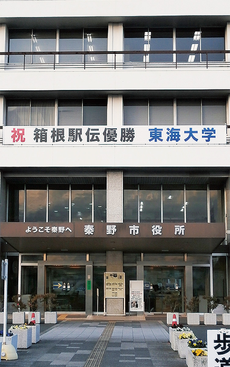 秦野市は、第95回箱根駅伝(東京箱根間往復大学駅伝競走)で、初出場から46年目にして初の総合優勝をした東海大学を祝う横断幕「祝箱根駅伝優勝 東海大学」を設置した。設置されているのは、市役所本庁舎3階、東海大学前駅ペデストリアンデッキ、東海大学前駅改札口の3カ所。