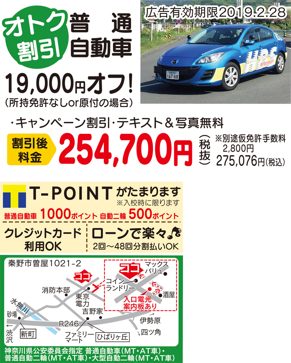 無料送迎バスもあり、通いやすく便利。今なら1万9千円オフ、さらに友達とペア入校で5千円引。検討中の方はお気軽に問い合わせを。