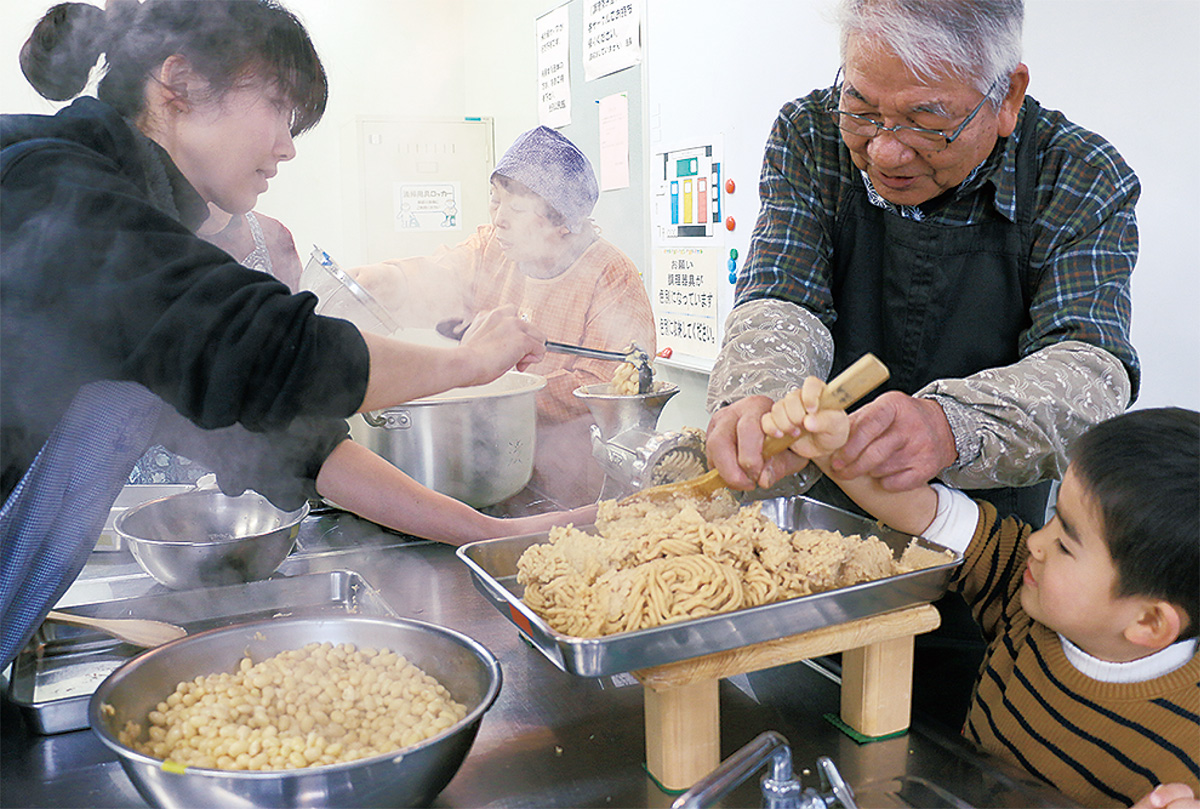 使用した大豆20kgは同会が育てたもの。水に浸しておいた大豆をゆで、ミートミンサーで潰し、樽へあけていった。「この大豆はゆでるだけで甘いんですよ」と廣瀬さん。母と参加した諏江亮樹(よしき)君(4)=堀川在住=は、廣瀬さんと一緒に大豆を潰しながら「お味噌を作るの楽しい。きのこがたっぷり入ったお味噌汁が食べたいな」と話した。その後、塩と混ぜた麹を入れ、均一になるまで混ぜて、当日の作業は終了。寝かした味噌は今年の夏に完成する。