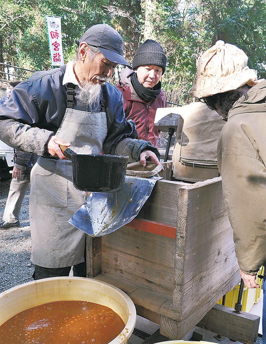 12日には同グループと日程をあわせ、神社境内で搾り作業を行った。丸山味噌醤油醸造店(長野県)の大豆と小麦・塩を混ぜて発酵させたもろみを50度位に沸かした井之明神水で溶き、搾りやすい状態に。搾り師の岩崎さんが搾り袋に溶いたもろみを入れ、木製の搾り槽(ふね)の中に袋を重ねていった。後に荷重をかけるため均等にする必要があり「簡単に見えて実は技術がいる」と岩崎さんは話す。搾り槽の口から透き通った色の醤油が出てくると、守山禰宜らは「美味しい」と生醤油を味わった。