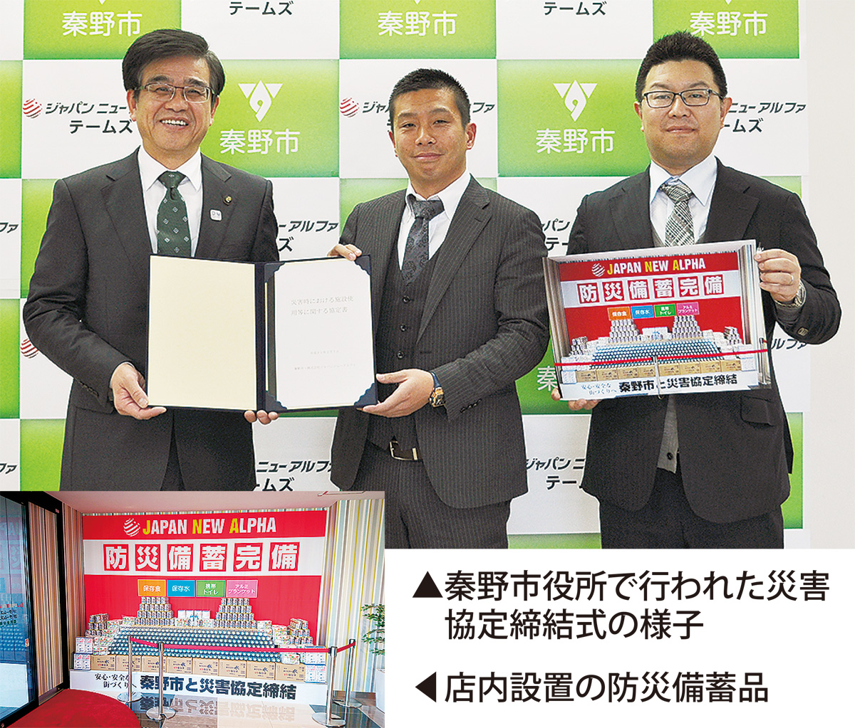 秦野市内でテームズや東海大前店など遊技事業を展開する「ジャパンニューアルファ」は、災害発生時におけるボランティアや被災者サポートがスムーズにできるようにするための災害協定を秦野市と2月7日に結んだ。