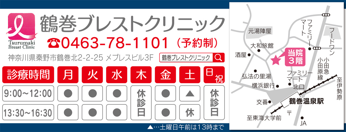 秦野市では40歳以上の人に登録制で2年毎に乳がん検診を実施。同院では受診時に自己検診指導も行う。「検診で異常がなかった時が自己検診を始めるチャンスです」と呼びかけている。