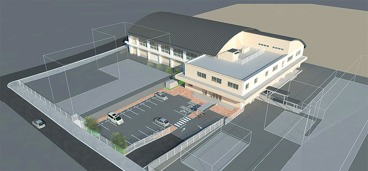 新たに建設される多機能型体育館は鉄筋コンクリート造一部鉄骨造2階建。建築面積2532・26平方メートル、延べ面積3473・41平方メートルで、国道246号線に面する北側敷地(現テニスコート及び第一校舎跡地)を使用し、学校機能と公民館、地域防災機能を揃えた建物と駐車場が整備される。