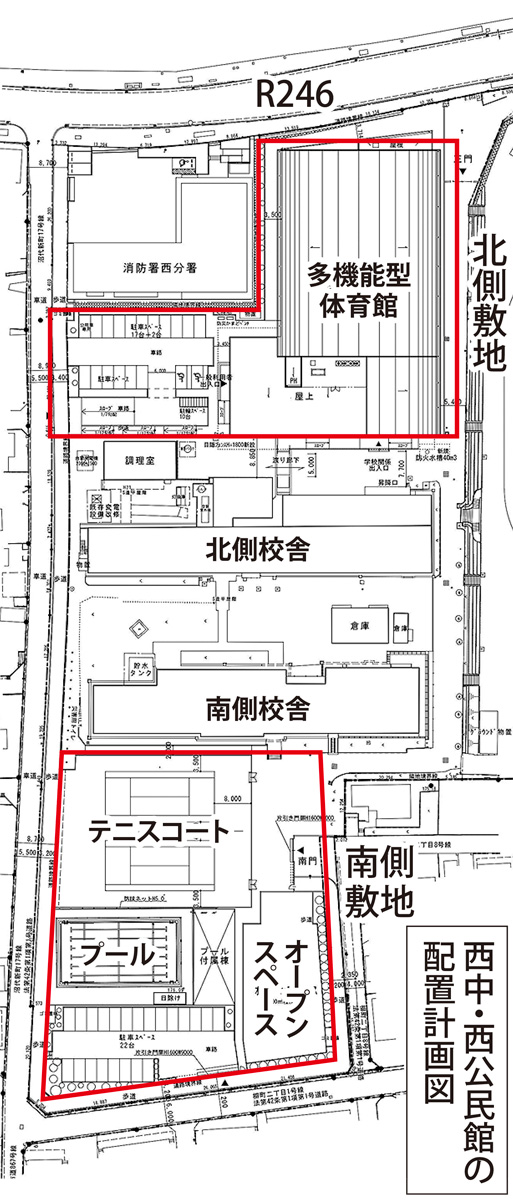 施設完成後は現在南側敷地にある既存の体育館と武道場、西公民館を解体。既存プール更衣室の改修やテニスコートの整備等を行い、関連工事が全て完了するのは21年6月頃を見込んでいる。