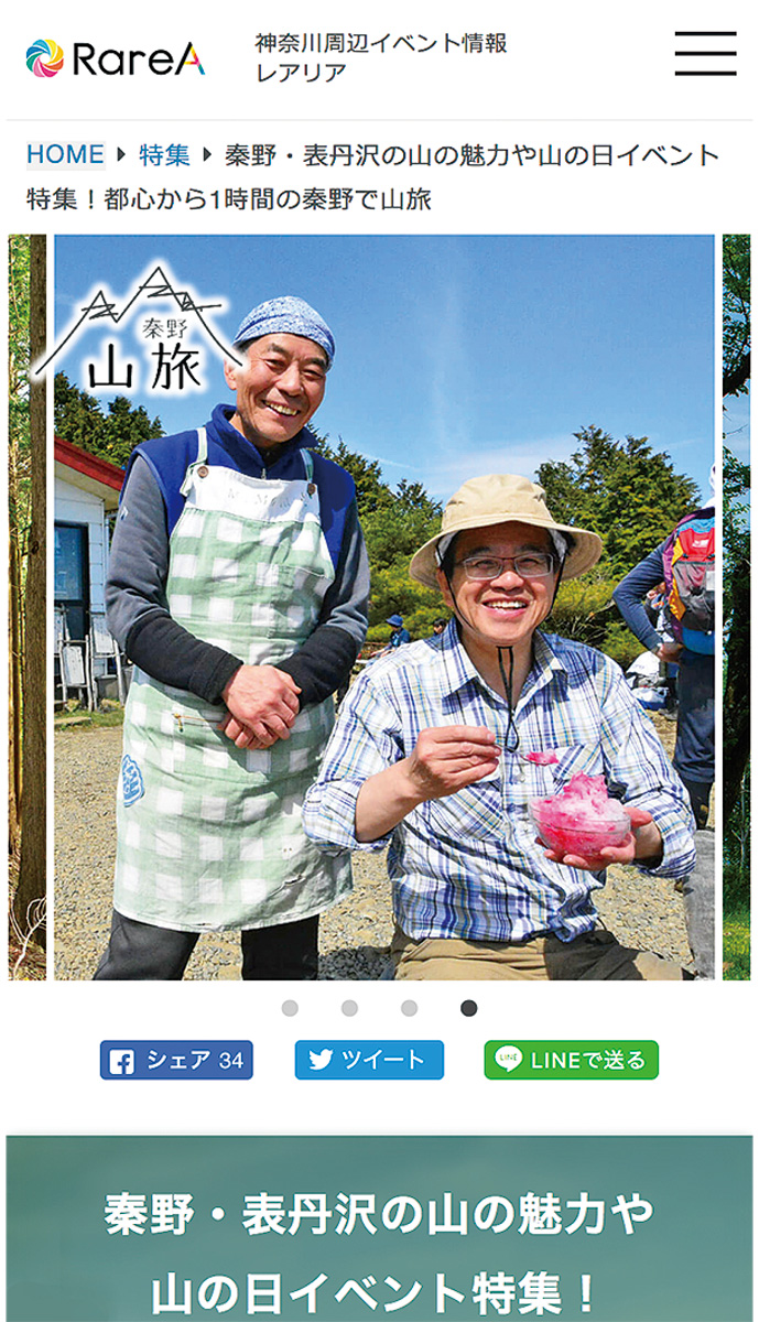 表丹沢の玄関口である秦野市。丹沢の山並みに囲まれたまちの魅力を『山の日』をきっかけに知って貰おうと、秦野市は7月からイベント情報サイト「RareA」内に特設ページ「秦野 山旅」を開設した。特設ページでは、8月11日(日)の『山の日』に県立秦野戸川公園で初開催される「かながわ山の日inHADANO」(神奈川県山岳連盟主催)の紹介のほか、登山・ハイキング情報、その他、山の日にちなんだグルメやイベント情報などを発信している。