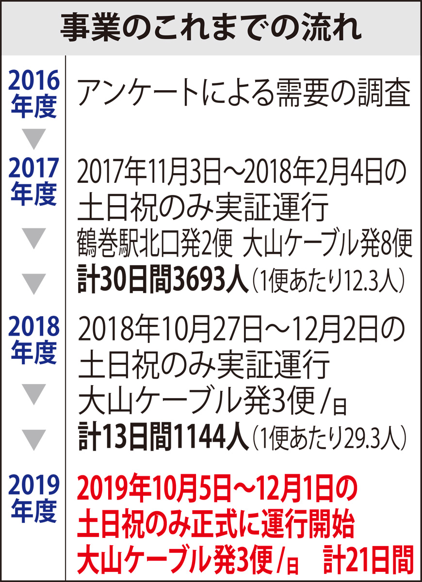 この際、1便あたりの乗車人数が12・3人だったことなどから、収益を考え2018年度は減便。10月27日から12月2日の土・日・祝日、大山ケーブル発の1日3便のみに絞り13日間で1144人、1便あたり29・3人という結果を得て、今年度の運行の詳細を決定した。