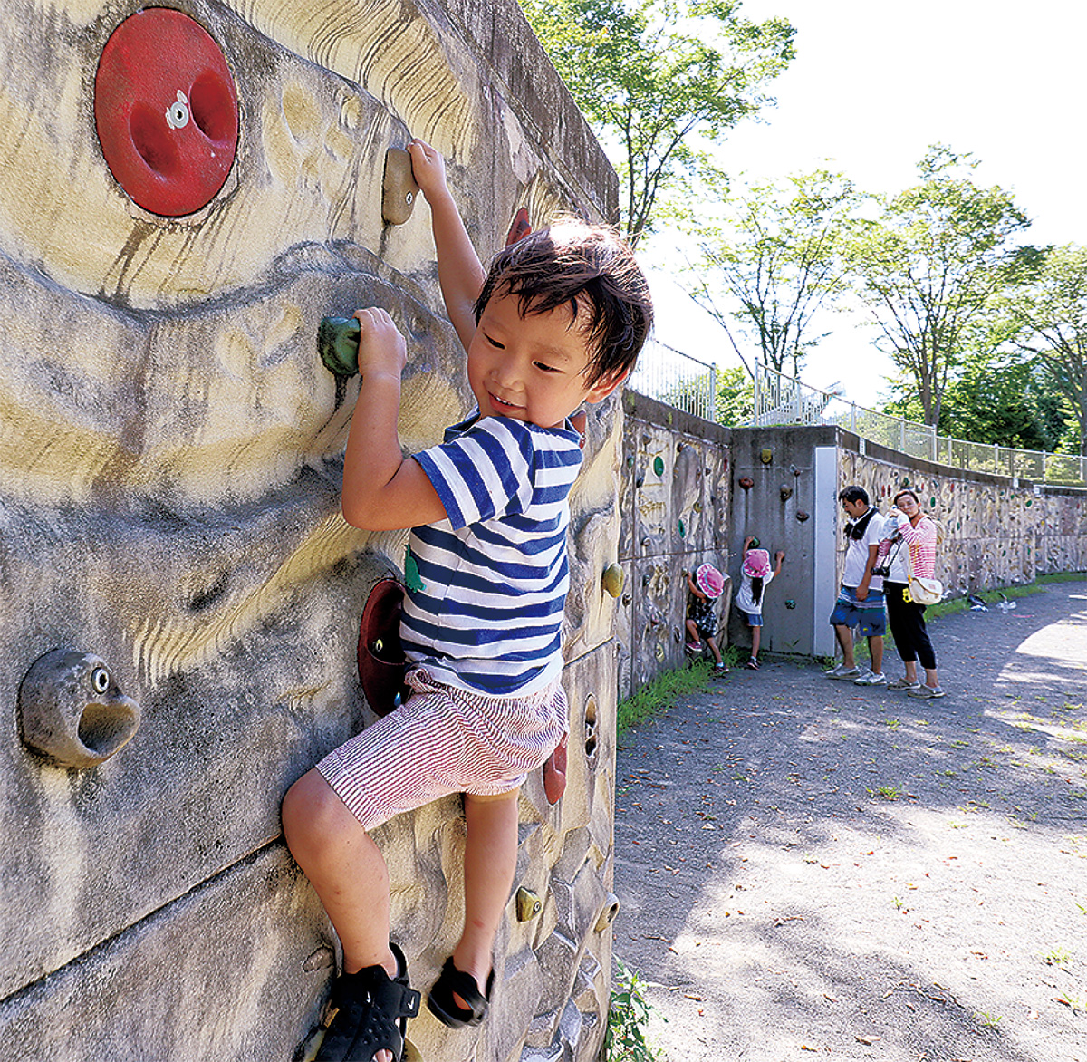 そのほか、隣接する山岳スポーツセンターでは親子体験クライミングなども実施。参加者らは指導を受けながら、手と足を使って15mのクライミングウォールを登っていった。クライミングウォールの向かいには2mのミニウォールもあり、見学に訪れた親子連れや子どもたちがはしゃぎながら登る姿も見られた。