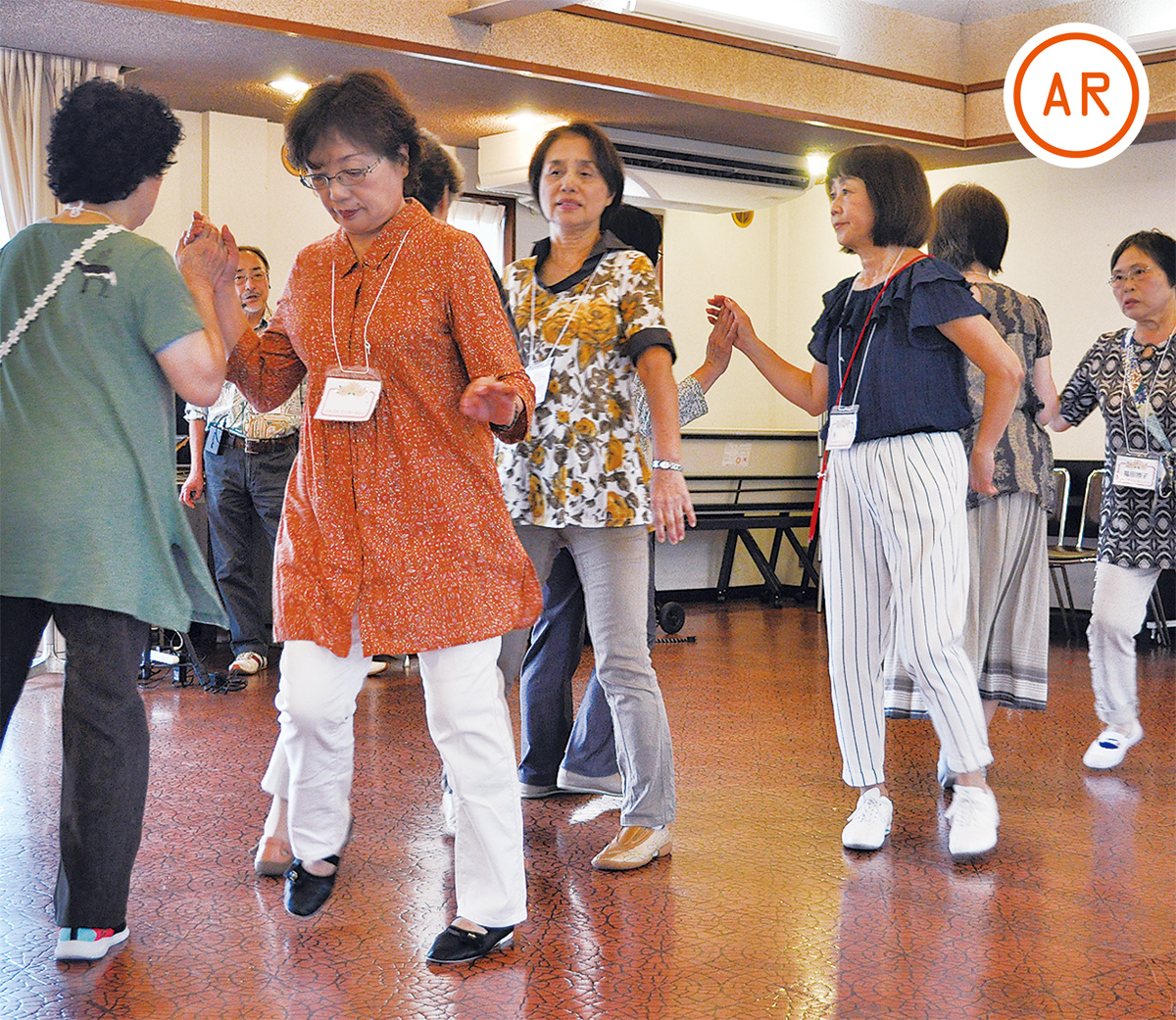 毎週土曜日に、鶴巻を拠点に活動するスクエアダンスのサークル「ツルマキ・ワン・モーメント」。9月28日には新メンバーも加え、音楽に合わせて楽しく踊っていた。