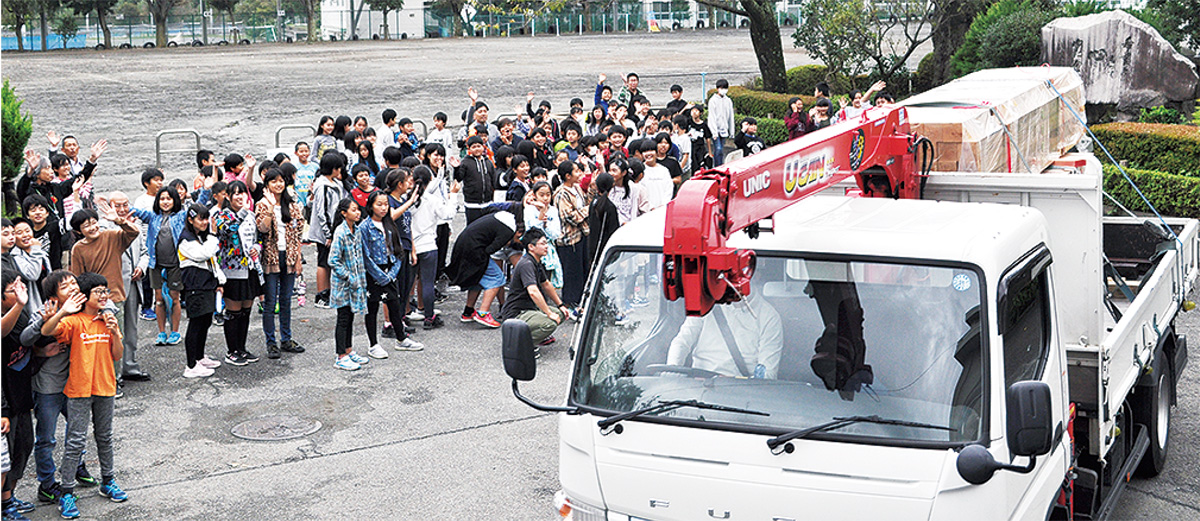 出発式では市環境共生課の谷芳生課長が「皆さんのおじいさんおばあさんが植えた木を切り出したもの。役目を終えて戻ってきた時を楽しみに、見送ってください」と挨拶。トラックのそばに6年生121人が集まり、製材された木材を「行ってらっしゃい」と手を振って見送っていた。