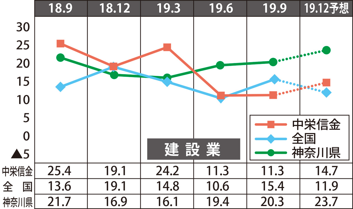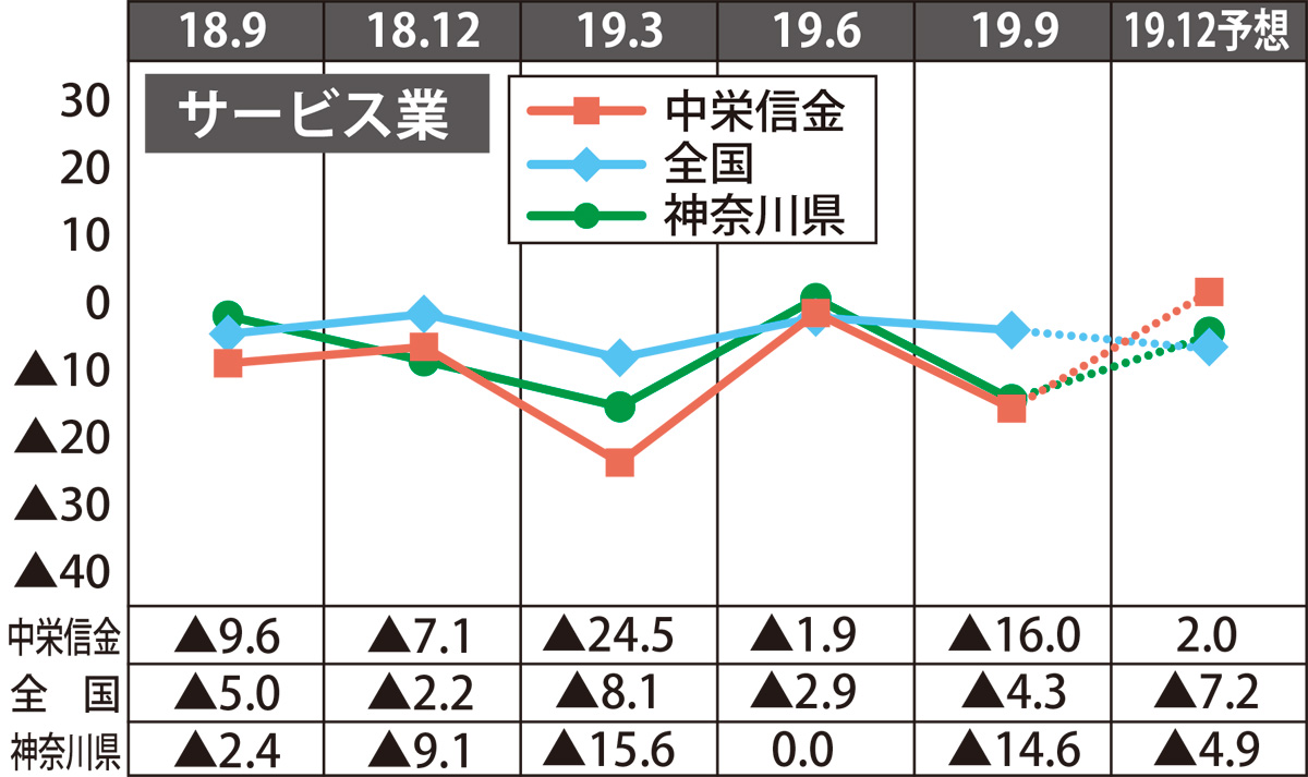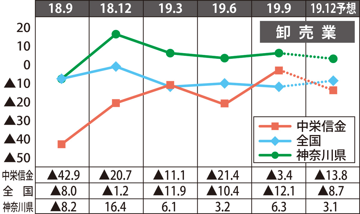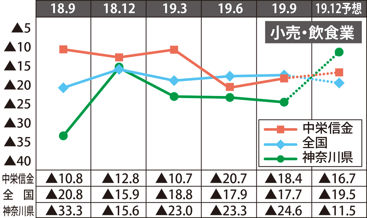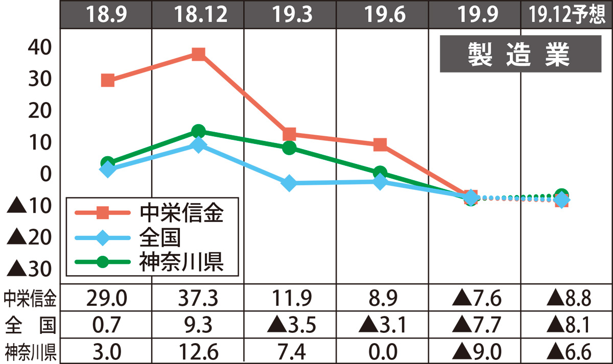 2019年7〜9月期の全業種総合の業況判断D.I.は▲(マイナス)4・5を示し、前回調査(4〜6月期)に比べ5・4ポイント悪化。景況感は3期連続で下降しており、18年4〜6月期以来のマイナス域に転じた。