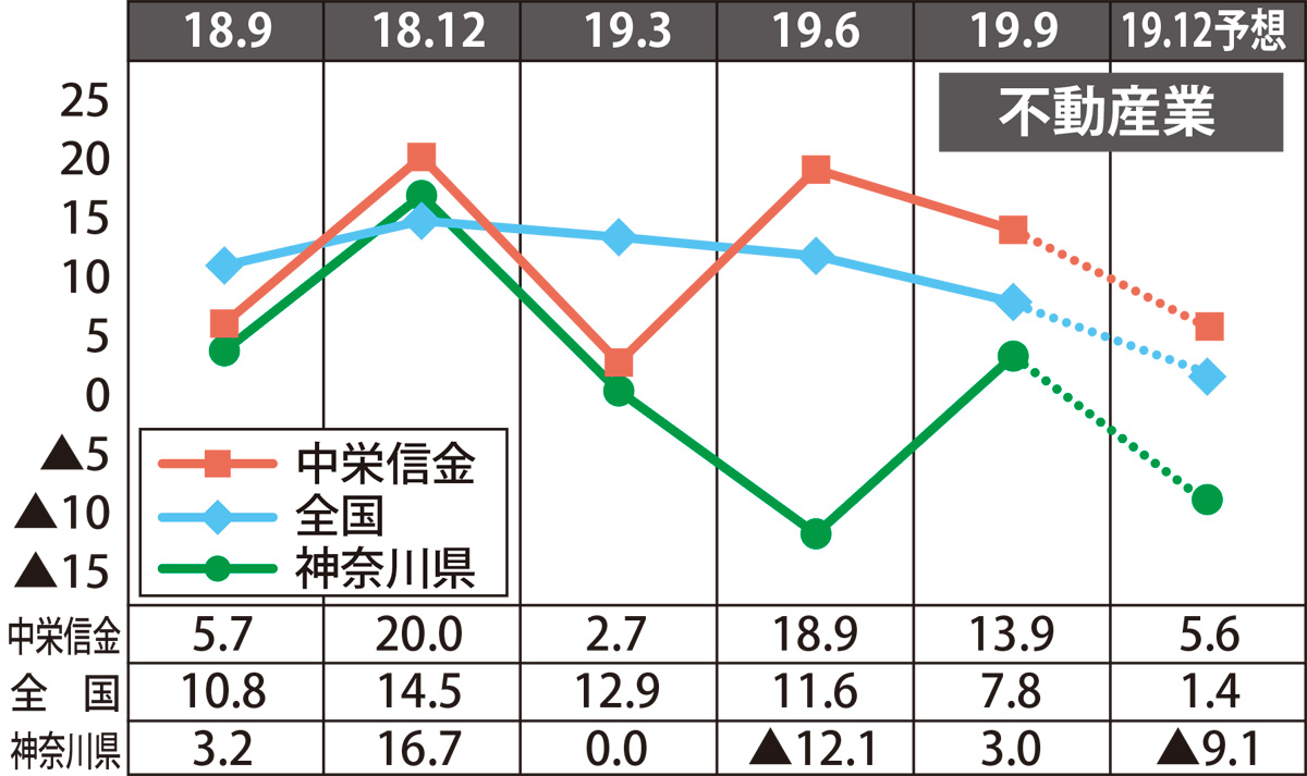 不動産業は、建設事業者の工期遅れにより、仕入物件の商品化に時間を要している企業が見られ、景況感を示す業況判断D.I.は前回調査比5・0ポイント悪化の13・9となった。