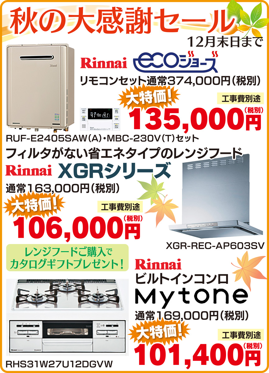 寒くなるこれからの季節。暮らしを支える(株)みどりや(露木徳英社長)では、リンナイのガス給湯機「エコジョーズ」などがお得に購入できる「秋の大感謝セール」を12月末まで実施する。