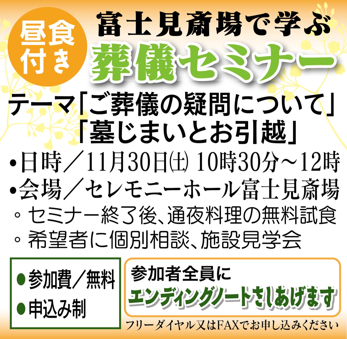 葬儀に関するさまざまな知識が学べる『昼食付き葬儀セミナー』が11月30日(土)、富士見斎場(石井時明代表取締役)で行われる。まだ関係ない、そう思っていても別れは突然訪れるもの。後悔しないためには事前に知識を得ておくことが重要で、「話を聞いてみたいが個別相談は行きにくい」という方にもお勧めの葬儀セミナーだ。