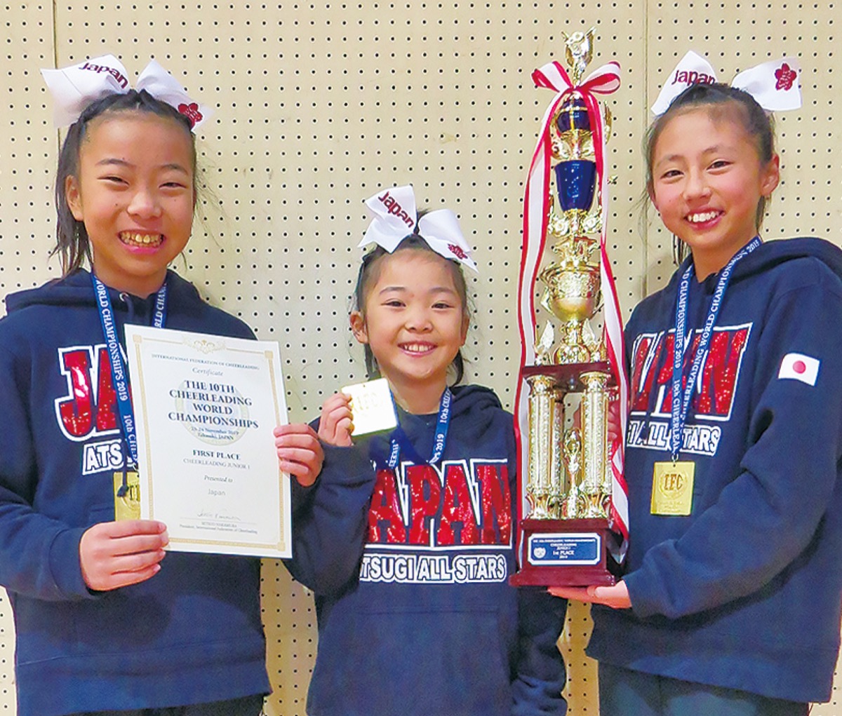 西小学校の上原加鈴さん(6年)、吉浦優愛さん(6年)、吉浦莉愛さん(4年)が日本代表のあつぎチアリーデイングチーム「ATSUGI ALL☆STARS」のメンバーとして「第10回チアリーディング世界選手権大会」に出場し、優勝を果たした。