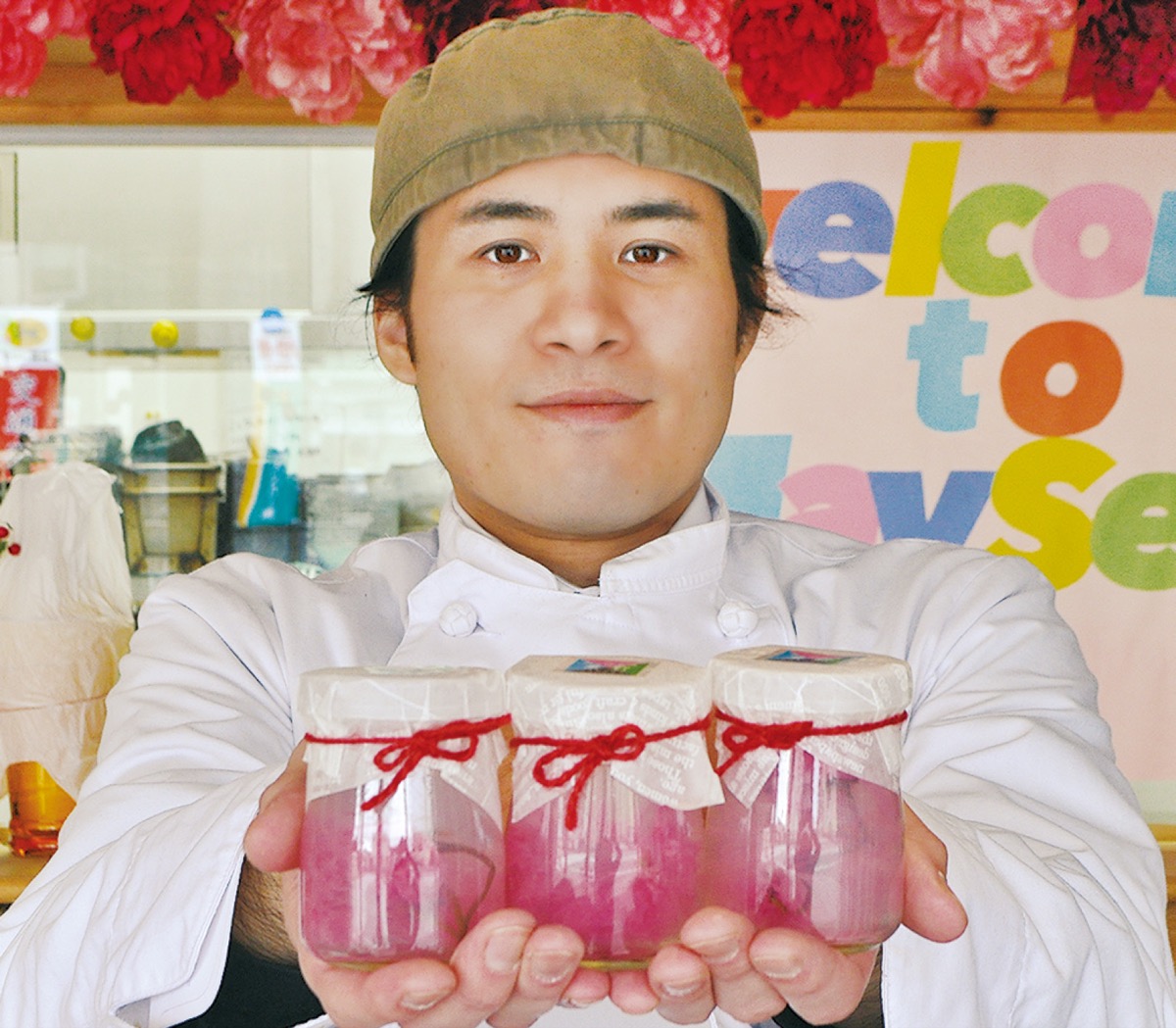MaySea’sの「はだの桜KANTEN」は、全国生産量の約8割を占める秦野産の八重桜と秦野の名水を使ったお菓子。地域で愛されるお菓子を作りたいとの思いから完成させたという。この八重桜は塩漬けのものが一般に流通しているが、同店では塩を使わず梅酢だけで作る独自製法の桜を使用し、ほんのりとした塩味が特長。また、加熱処理が必要のない寒天にすることで、桜の色を保ち、見た目にもこだわっている。製造者で同店店長のグアルディア・ウィリアムさんは「秦野の桜を上手く使ってできないかと試行錯誤しながら作りました。この受賞を機に有名になってくれれば」と話した。