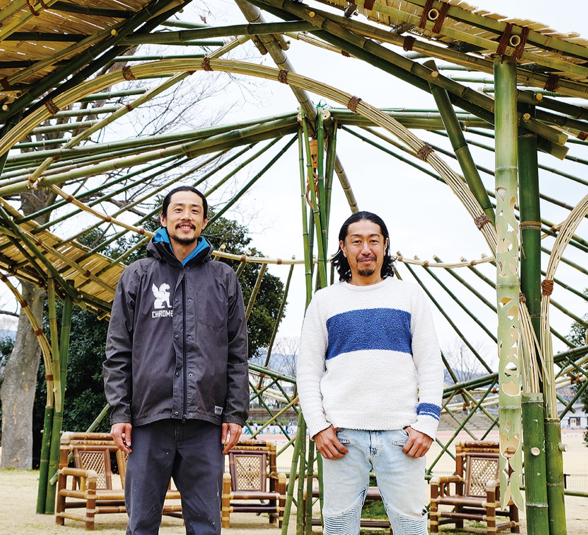 素材の竹は秦野市内の竹林から、プロジェクトのメンバーで切り出した。デザイナーの胡向陽さんが設計し縄などを使ってくみ上げた。太い竹を使うところ、細く割いた竹を束ねて曲げているところなど工夫が施され、しっかりとした強度が保たれている。「竹という素材の良さを是非知ってほしい」と話す。