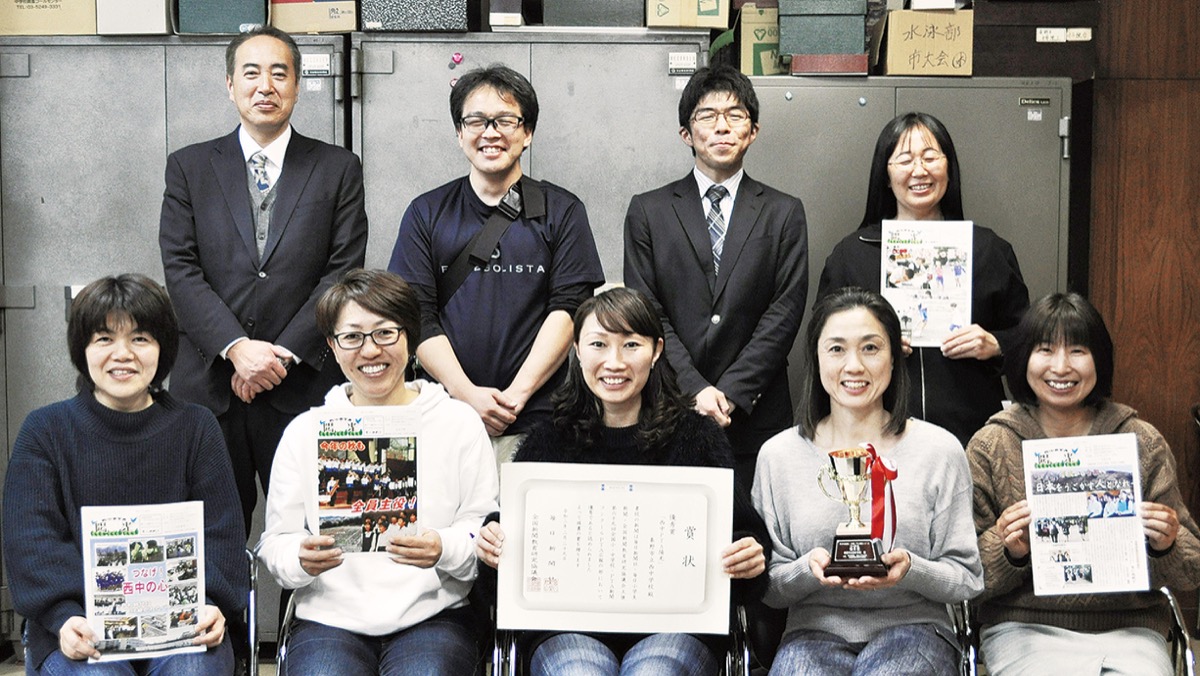 同委員会は「西中PTA陽光」の5月・7月・12月発行の3紙を提出。生徒のスマホ事情や生活・学習等についてアンケートを実施した他、行事はもちろん授業にも赴き取材をするなど、「読みたい」と思われる紙面づくりにこだわった。また、西中が指定されている学校・保護者・地域が協働して取り組む学校づくり「コミュニティ・スクール」について、保護者の認知度の低さに着目。実際に会議に出席して活動を報告したり、保護者からの質問に答えたりと認知拡大に尽力した。このようなアンケートや取材、それに対する考察が評価されたという。前原委員長は「学校や地域の方々の協力があってこその受賞。委員同士もできること・得意分野を生かして楽しく活動ができました」と振り返った。また、田中健嗣校長は「学校と保護者を繋ぐ架け橋であり、その距離を短くしてくれた」、西中PTAの鈴木真会長は「生徒が自分たちの意見が採用されると気づかせてもらえる広報紙だった」と受賞を讃えた。