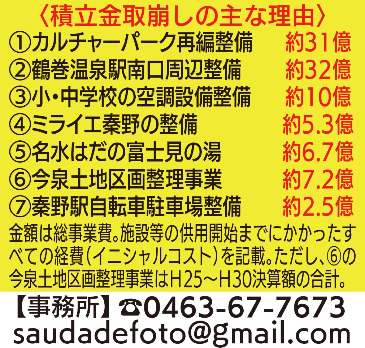 そこで「この一年間にどれだけの黒字または赤字を増やしたのか」をみるのが単年度収支。そのやりくりを示すのが実質単年度収支。平成29年度の秦野市の単年度収支は8億円。積立金取崩し額は20億円。実質単年度収支は8―20でマイナス12億円となる。つまり、表面上は黒字に見えても実際には積立金を取崩して黒字を出している。その額(H25年〜H30年)約74億円。その主な理由は、図参照。