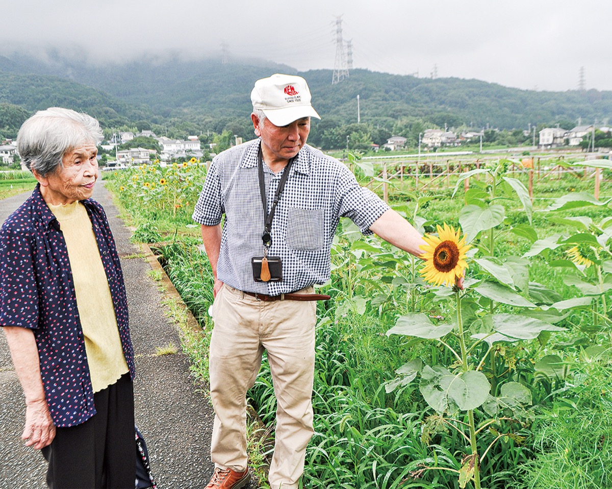 このヒマワリは秦野市里地里山を育む会(浅見一義会長)が植えたもの。付近の土地の一部を所有している小磯チヨさん(86)が自分で耕作できなくなり、3年ほど前に休耕地を再生する活動をしている浅見さんに相談して、管理を依頼したことがきっかけ。