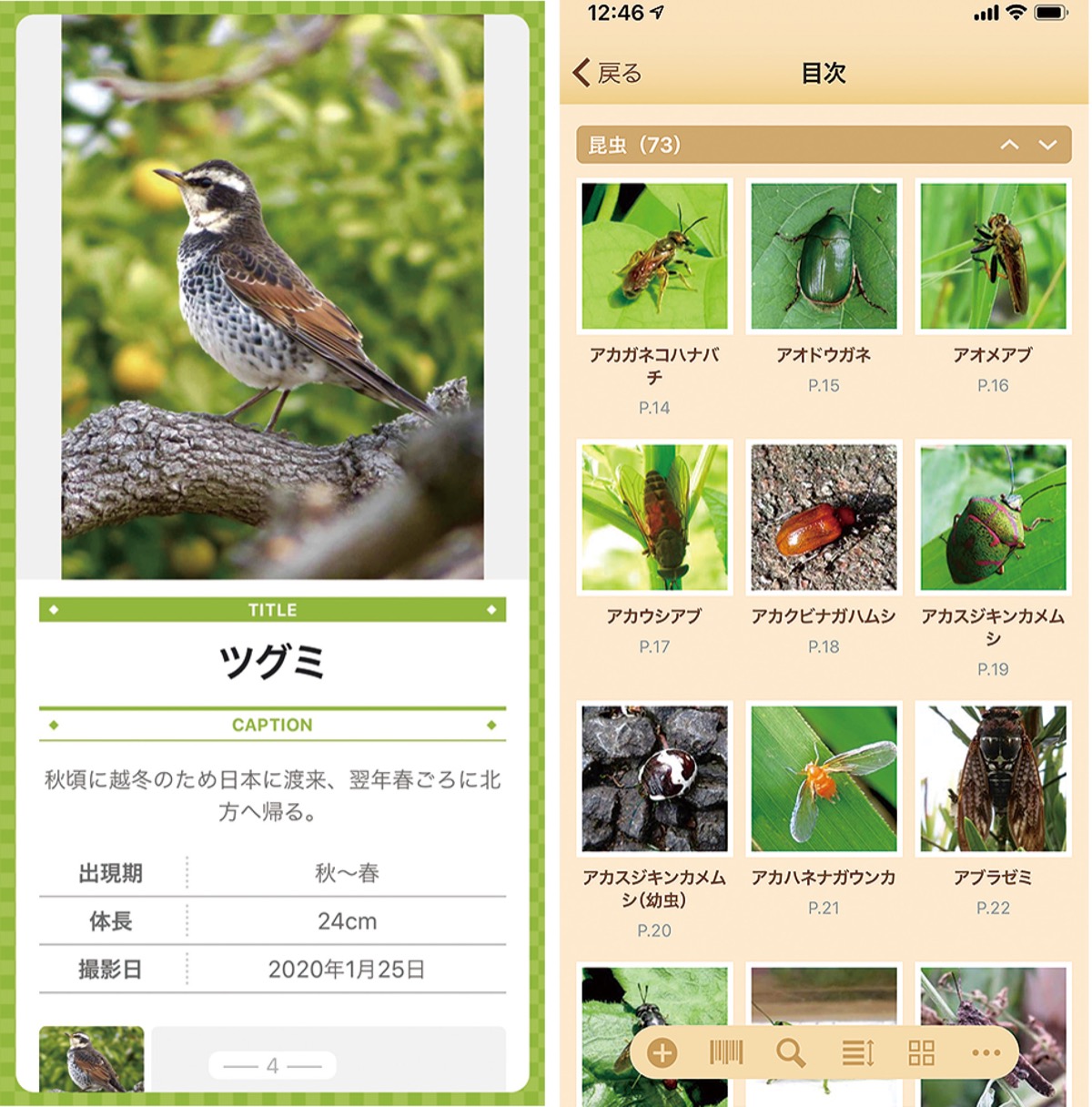 「My図鑑の良いところは汎用性の高さです。自分で撮った昆虫や野鳥、魚を図鑑にするのも大正解。ただ、生き物以外にも写真日記や料理をまとめたり、コレクションや御朱印などを記録するなど、さまざまな図鑑を作って楽しんでいただいているようです」と話す。小学生から高齢者まで使えるようにと操作性も簡単に設定しており、数種類のテンプレートを使うことでテーマごとに見た目を変えることも可能。写真と一緒にメモを保存できるアプリは「意外と少ない」そうで、利用者は自由な発想で図鑑を作成しているという。