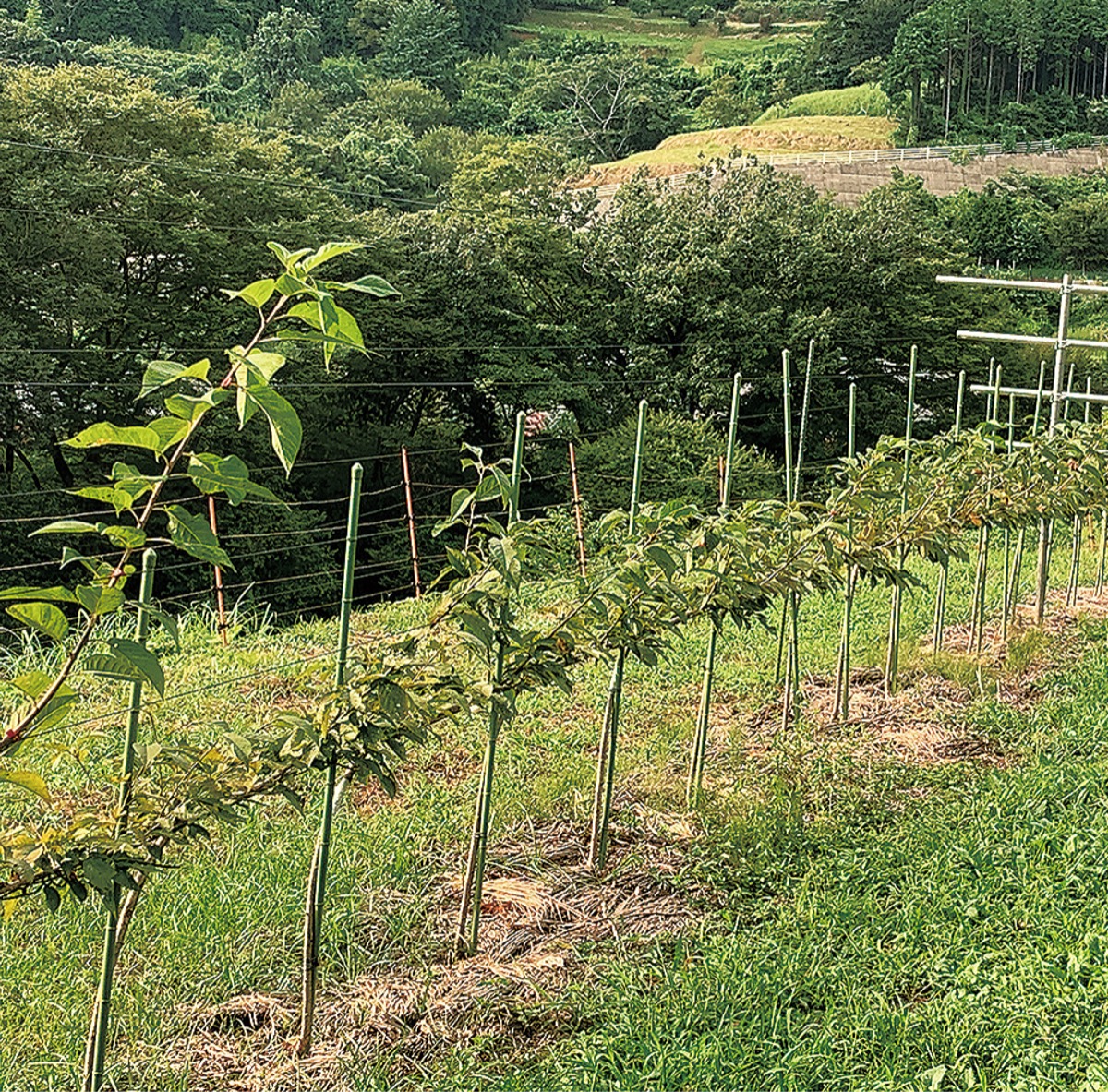 代表の小池さんがジョイント栽培を開発した神奈川県農業技術センターに勤めていることから、センター職員の支援も得て4月に接木作業を実施。メンバーが主枝を地面と平行に曲げ、隣の木に接いだ。さらに7月には接木から伸びた細い枝を支柱に結ぶ誘引作業を行い、現在も順調に生育している。