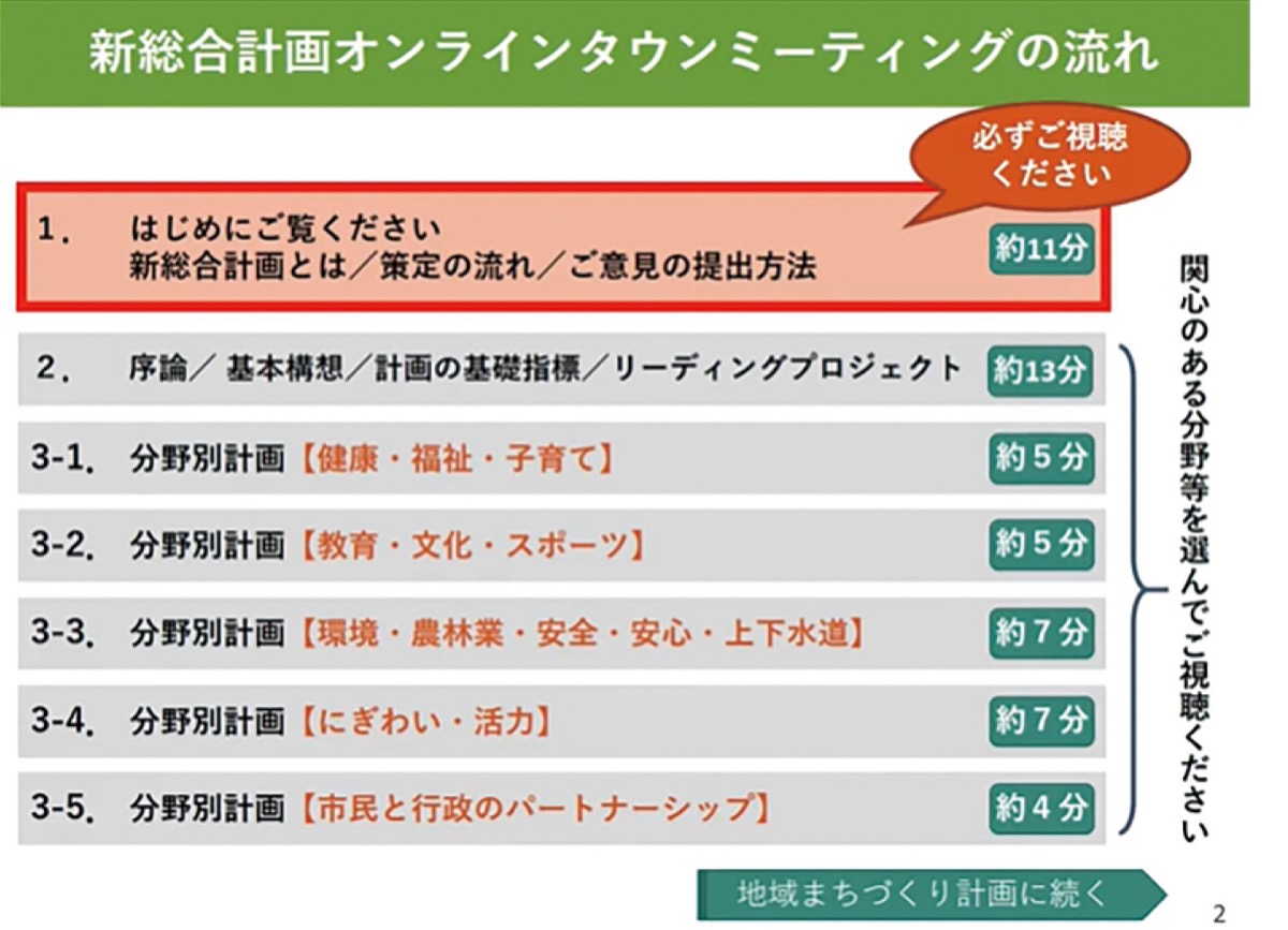 例年、総合計画策定の前年に、市内8地区で市長と市民が直接意見交換をする「タウンミーティング」内で素案の説明が行われている。しかし、今年は新型コロナ感染防止の観点から「タウンミーティング」を中止。市民への説明機会がなくなったことから、素案の内容を解説した動画を配信することで、広く意見を集めることにした。