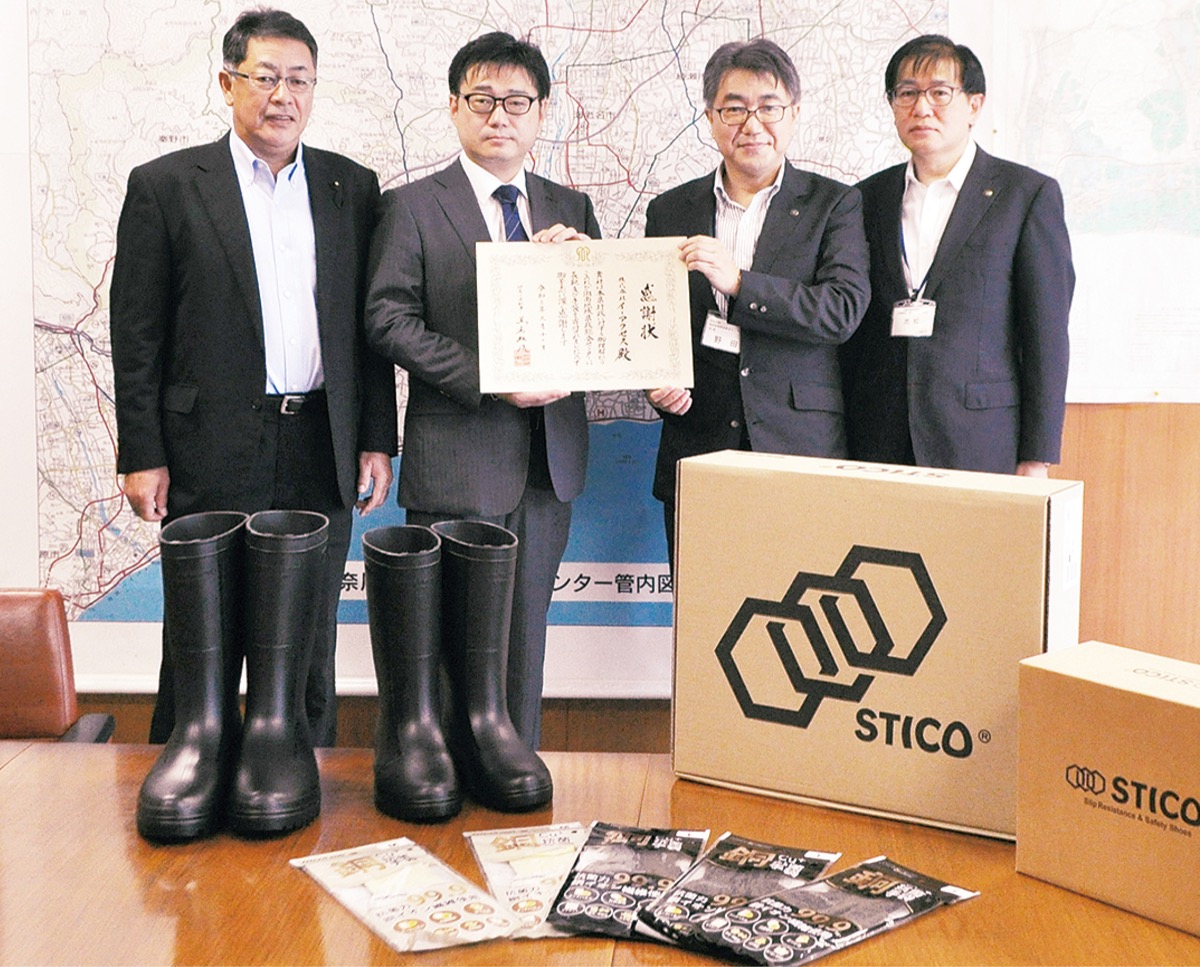 災害対策などの現場で活用してもらおうと、曽屋に工場を構える株式会社イーアクセス(延(よん)省律(そんゆる)代表取締役)が、神奈川県に同社製造の超軽量長靴などを寄付した。