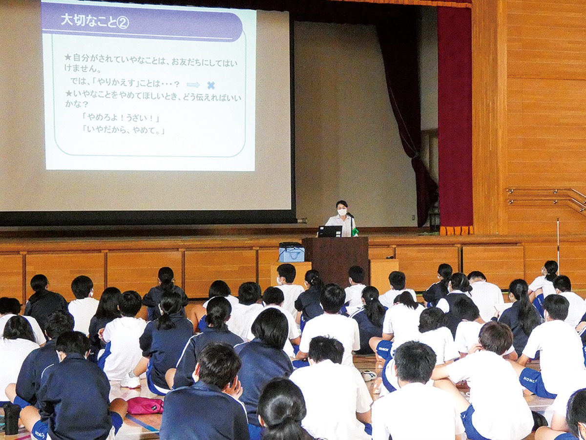 講演は「考えよう やっていいこと 悪いこと」と題し、いじめは被害者はもちろん、加害者も後から傷つき苦しむと説明。肩パン(肩をパンチすること)を例に挙げ「やった人は”いじり”のつもりでも、暴力だと感じる人もいる。同じことをされてもどのくらい嫌かは人それぞれ。自分は平気、ではなく相手が嫌がっているかどうか考えることが大切」と話した。生徒らは自分がされて嫌なこと、友達がいじめられていたらどういう態度を取るかなどをワークシートに書き出し、相手の気持ちを考え、行動することの大切さを学んでいた。