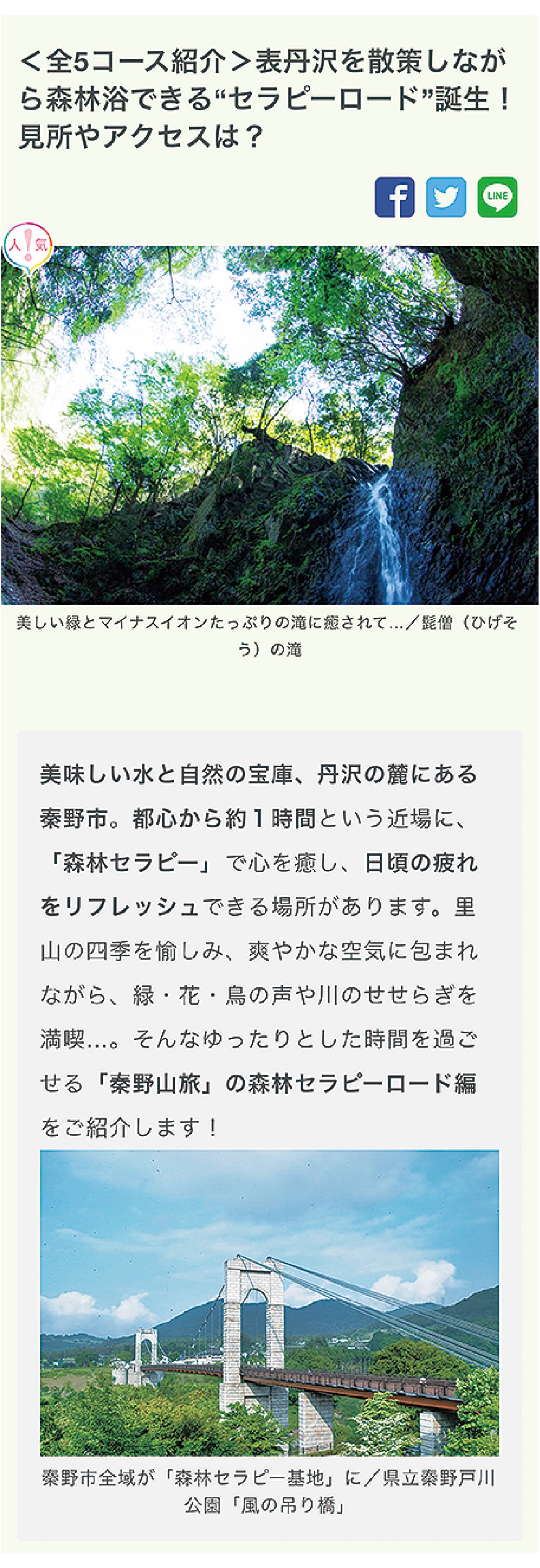 今回新たに追加されたコンテンツは今年4月に認定された「森林セラピーロード」5コース。各コースの特徴や見どころと共に地図も紹介されており、ページを参考に散策できる。秦野市では近日、森林セラピーロードを活用して実施しているセラピーイベントの体験レポートも公開予定。