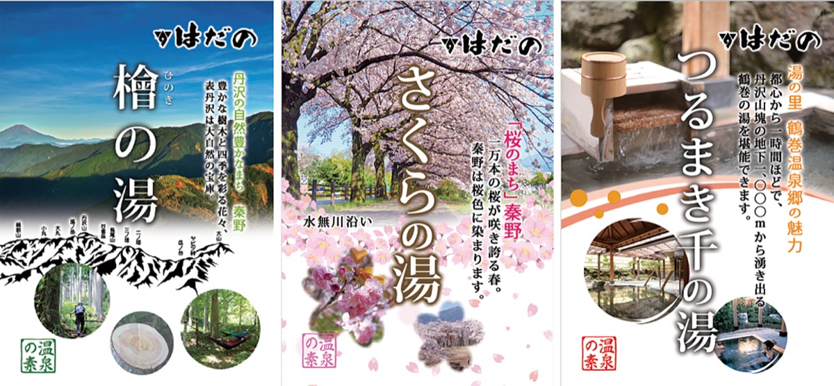 桜は「さくらの湯」と名付け、パッケージにはカルチャーパーク沿いのソメイヨシノの並木道などをデザイン。入浴剤の色もピンクにし、桜の香りがするものとなっている。一方、「檜の湯」は秦野産材のPRも兼ねて、丹沢の山並みや森の雰囲気をパッケージデザインに反映。ヒノキの香りと、緑に色付く入浴剤にしたという。色や香りの違いはあるが、入浴剤の成分は全て「つるまき千の湯」と同じで、3種類を1パックとして販売している。