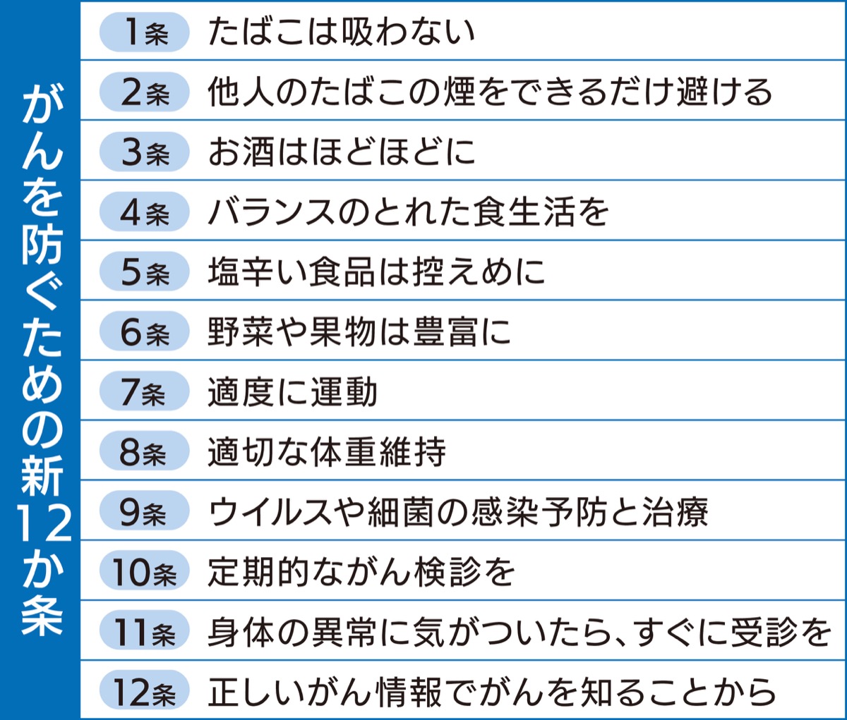がんの予防のために国立がんセンターが2011年にまとめたのが「がんを防ぐための新12か条」(表参照)。なかでも気をつけてほしいのは「たばこを吸わないこと。煙を吸わないこと(受動喫煙)」と両医師。吸う人と吸わない人のがん罹患率は1・5倍違う。この結果をもとにすると、たばこを吸っていなければ、男性の29%が「がん」にならなかったことになる。なんといっても予防に必要なのは”禁煙”。たばこを吸わないことは、がんだけでなくすべての病気の予防になる。