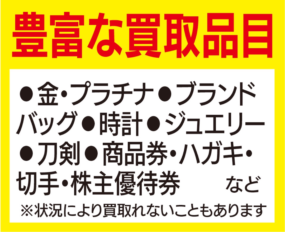 金のほか、プラチナ、貴金属、ダイヤ、宝石、ブランド時計、バッグ、各種ブランド品、切手、ハガキ、金貨、銀貨、古銭、勲章、カメラ、ブランド食器、鉄道模型、絵画、掛け軸など幅広く買取強化中。気になることは気軽にお電話を。