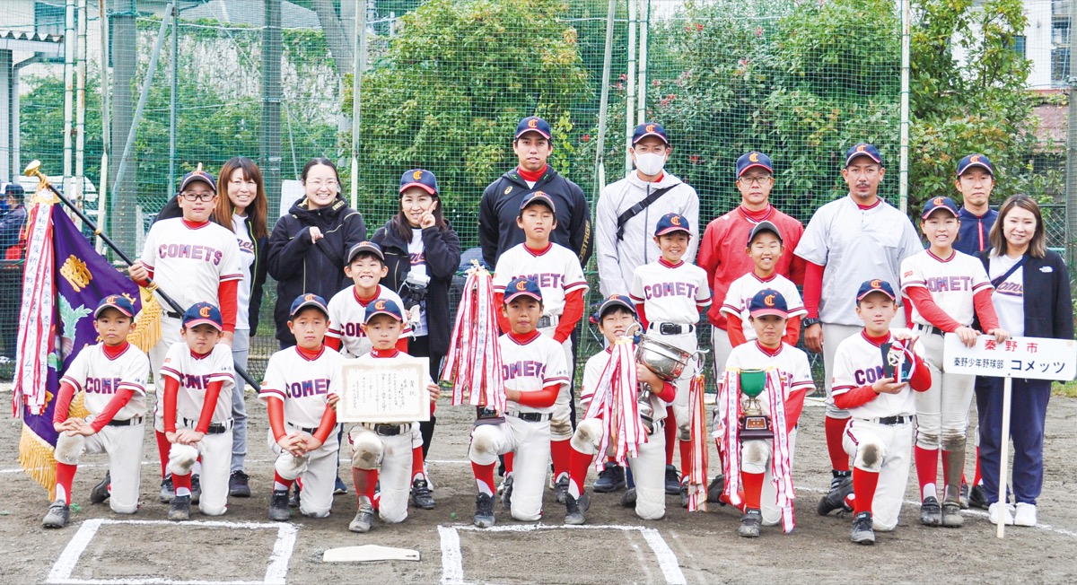 秦野市少年野球連盟(久保寺邦夫会長・今井茂文理事長)が主催する「タウンニュース旗争奪新人戦大会」の決勝戦が10月18日、なでしこ運動広場で開催され、「秦野少年野球部 コメッツ」が栄光を勝ち取った。同大会は9月27日から開催され、11チームが参加。新型コロナウイルスの影響で練習がままならない環境の中、全チーム・全選手が力いっぱいのプレーを見せた。