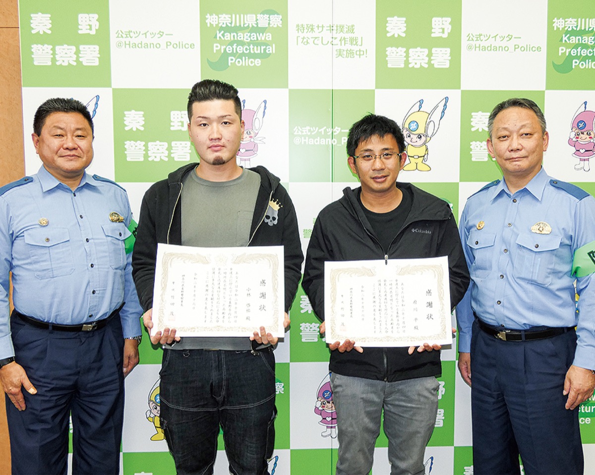 秦野市在住の府川平さん(31)と小林啓祐さん(23)が人命保護を行ったとして10月16日、秦野警察署(竹田茂署長)から感謝状を贈呈された。