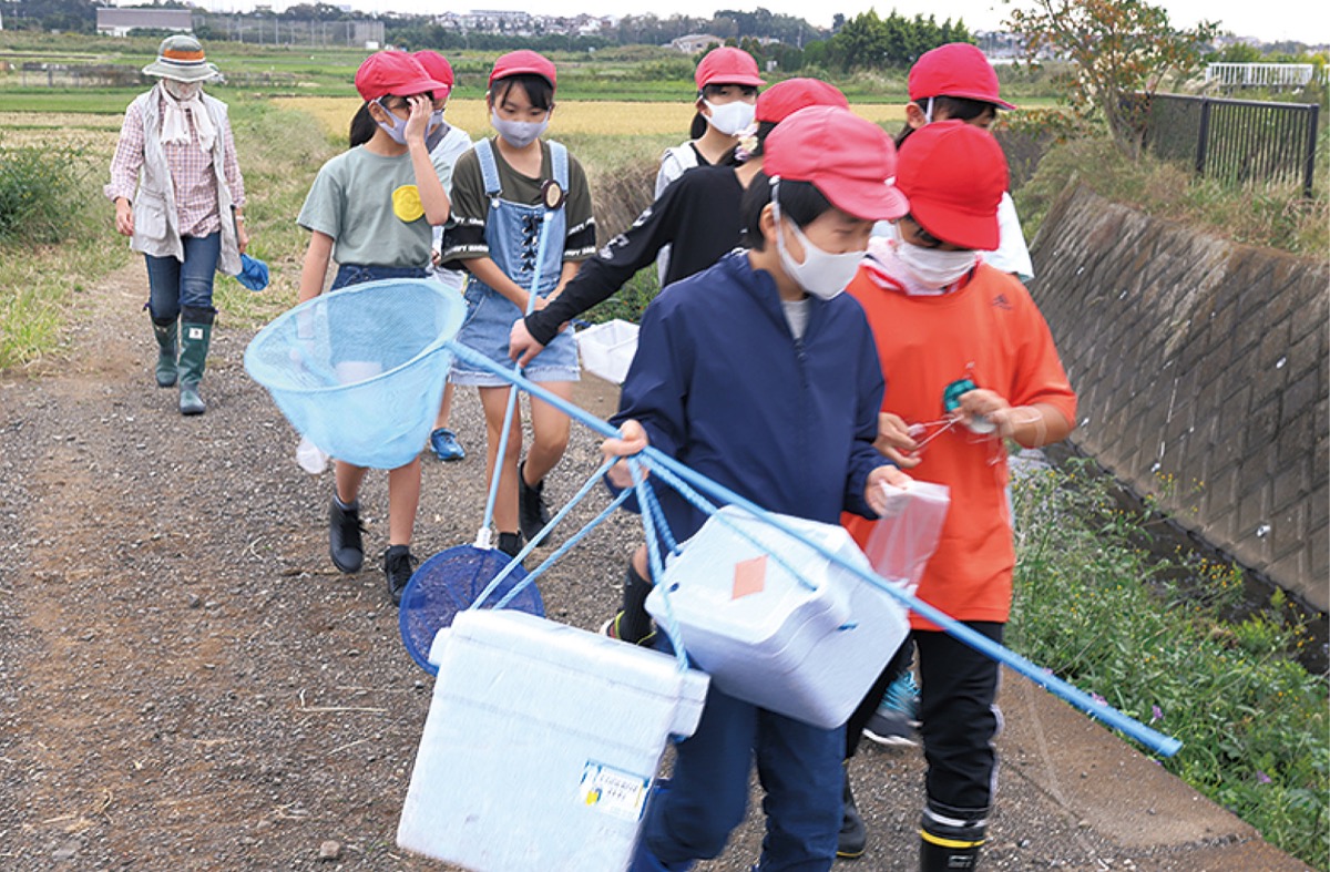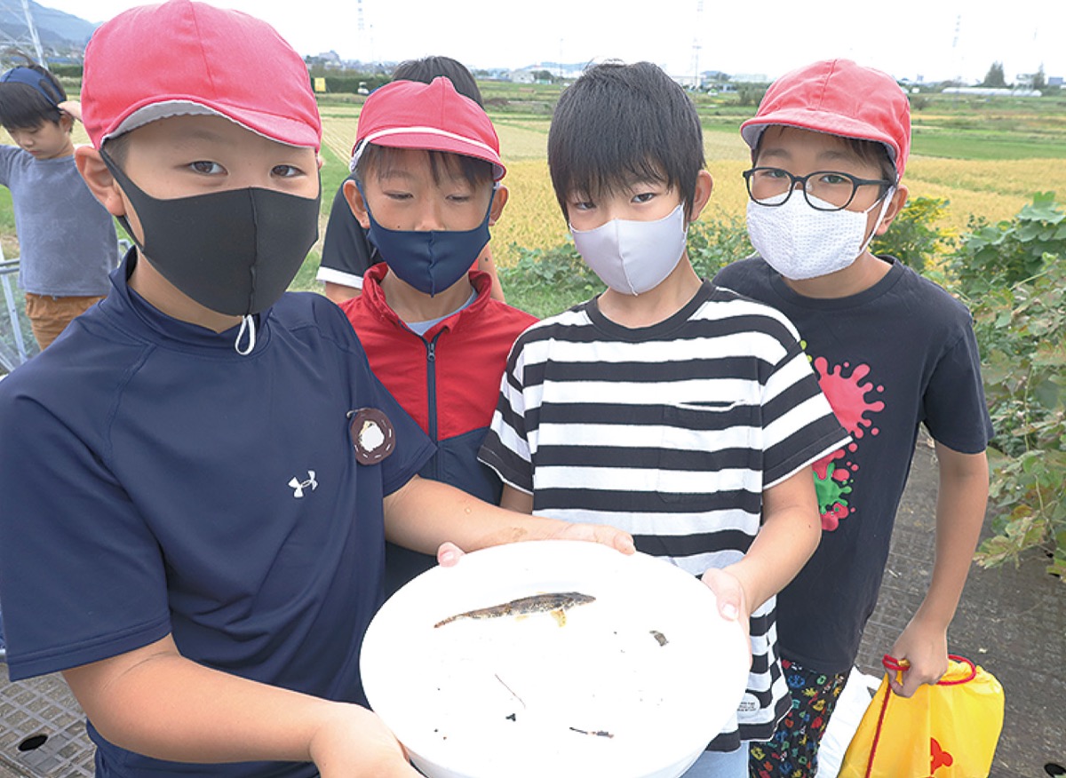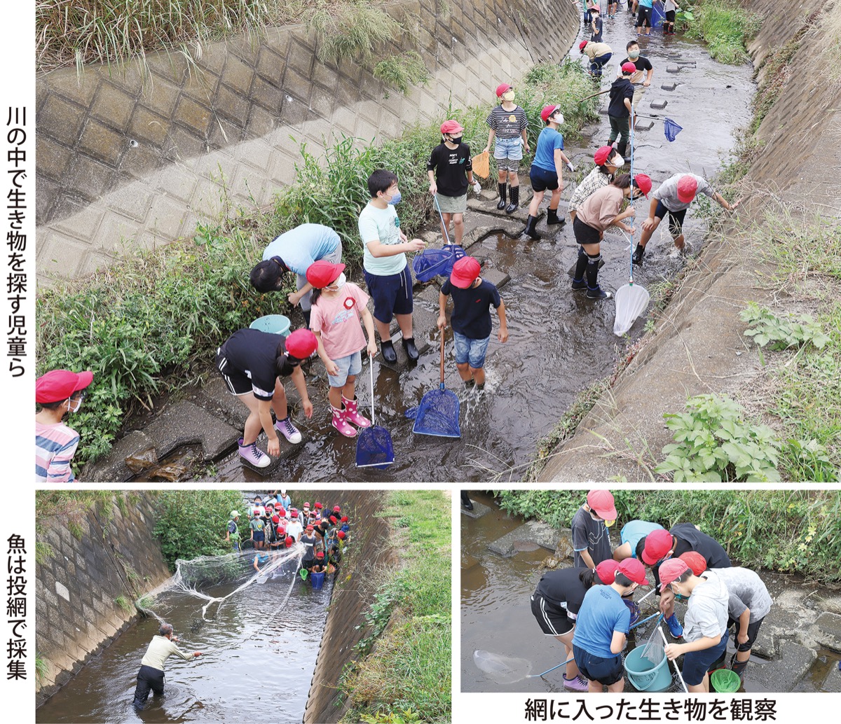 児童らは手に網を持ち、学校から川まで歩いて向かった。途中川の上から水面をのぞき込むと、小さな魚影が素早く動き回る様子が見られ、子どもたちは「何かいる」「魚がいっぱい」など声を上げた。川に入って網で草の中を探るなどクラスメートと協力しながら網をすくうと、いろいろな生物が入り、児童からは「エビがとれたよ」「ヤゴだよ」といった歓声が上がった。