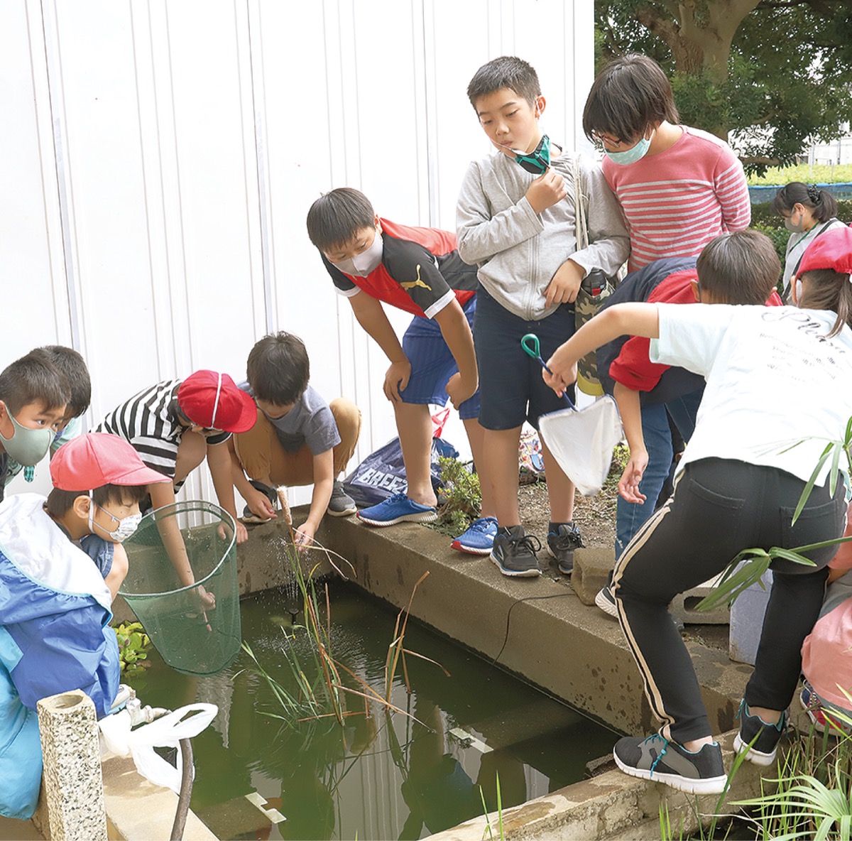 捕まえた生物の中からくずはの家のスタッフが、学校での飼育に相応しいものを選別し、学校に持ち帰り、児童が丁寧に池に放した。担任の関ひろみ教諭は「児童たちは廃材を活用して看板を作成したり工夫しながら、今回整備した環境がずっと持続できるように取り組む。整備を進めてビオトープのようにしたいと、子どもたちは意欲を持っている」と話す。