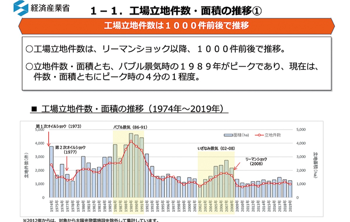 意見 経済産業省のデータによると、工場の立地件数と面積はバブル期の4分の1であり、設備投資額、雇用予定者数もそれに比例する。堀山下テクノパークはバブル絶頂期の1991年に完成したものであり、今とは文脈を分けて考えるべき。