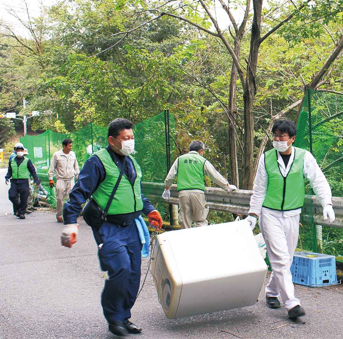 この日は36人が参加。震生湖周辺と西大竹周辺、国道246号蛇塚交差点付近の3カ所で、不法投棄物の撤去作業などを行った。