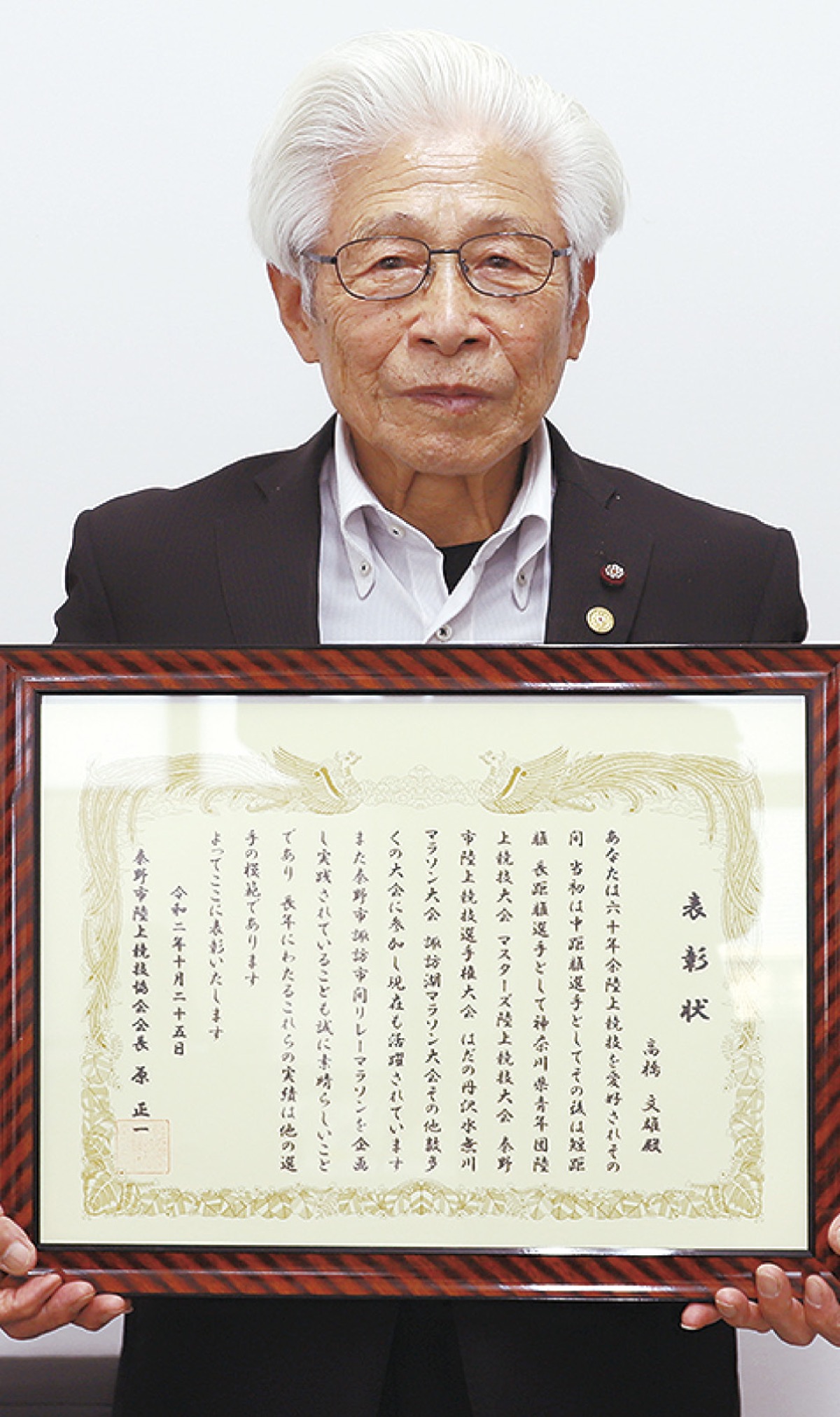 高橋文雄さん(86・大秦町)が10月25日、秦野市陸上競技協会から表彰を受けた。