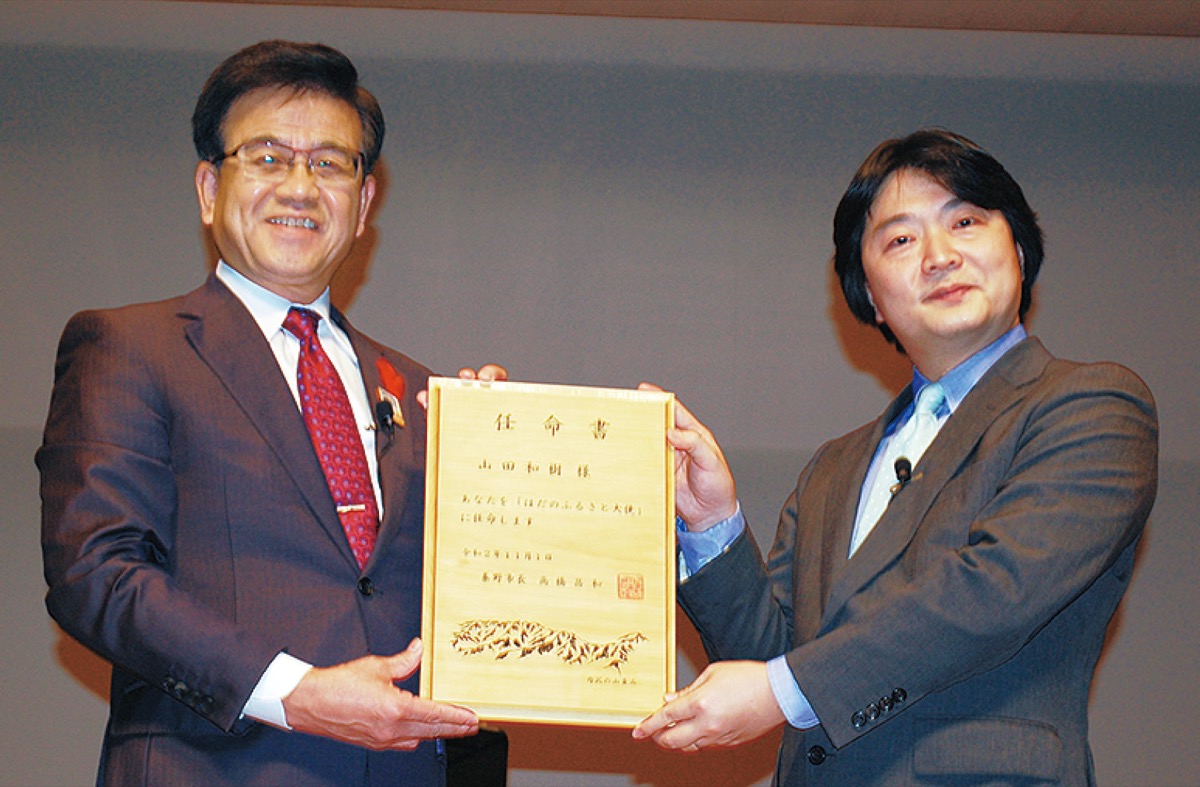 クアーズテック秦野カルチャーホールで行われた任命式に山田さんは高橋昌和市長とともに登壇。秦野産檜で作られた任命書が手渡され=写真、続いて、ふるさと大使の名刺、秦野の名産品の詰合せが贈られた。
