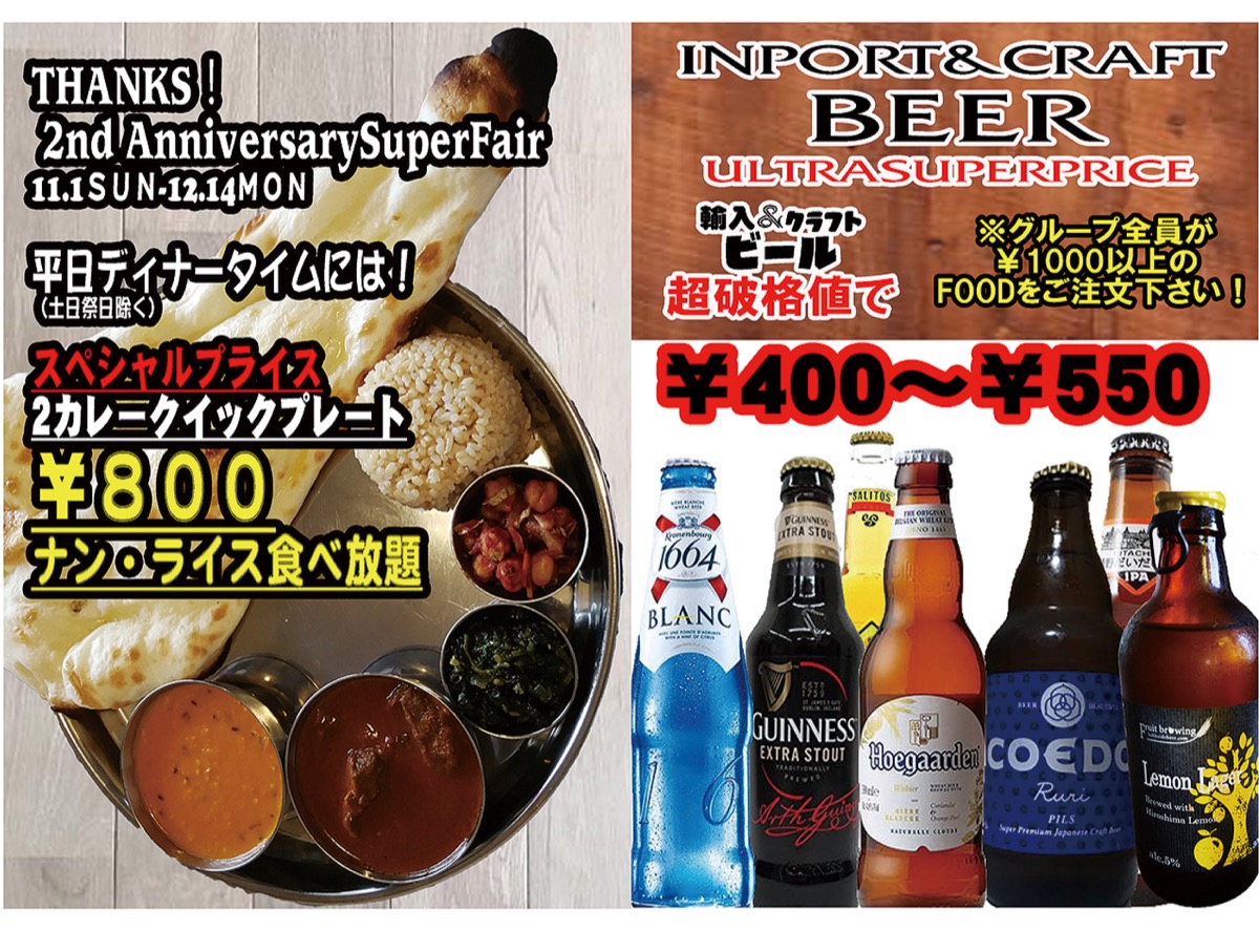 今月、開店2周年を迎えた「ほりかわ珈琲店」が日頃の感謝を込め、フェアを実施中。期間中は平日17時からのディナータイムで通常1千円の『ナン・ライス食べ放題2種のカレープレート』を800円で提供するほか、1人1千円以上(子ども除く)のフード注文で『輸入・クラフトビール』をほぼ原価で楽しめるお得なフェアになっている。