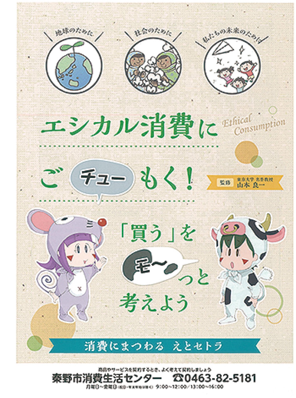 秦野市では物を買う機会が多くなる年末年始に向け、「高齢者の消費トラブル防止」と「エシカル消費」を啓発するパンフレットを作成し、配布している。パンフレットには人気SF漫画『ぼくらの』や、秦野を舞台にした自転車漫画『のりりん』の作者で秦野在住の漫画家・鬼頭(きとう)莫宏(もひろ)さんが描いた干支のキャラクターを起用している。