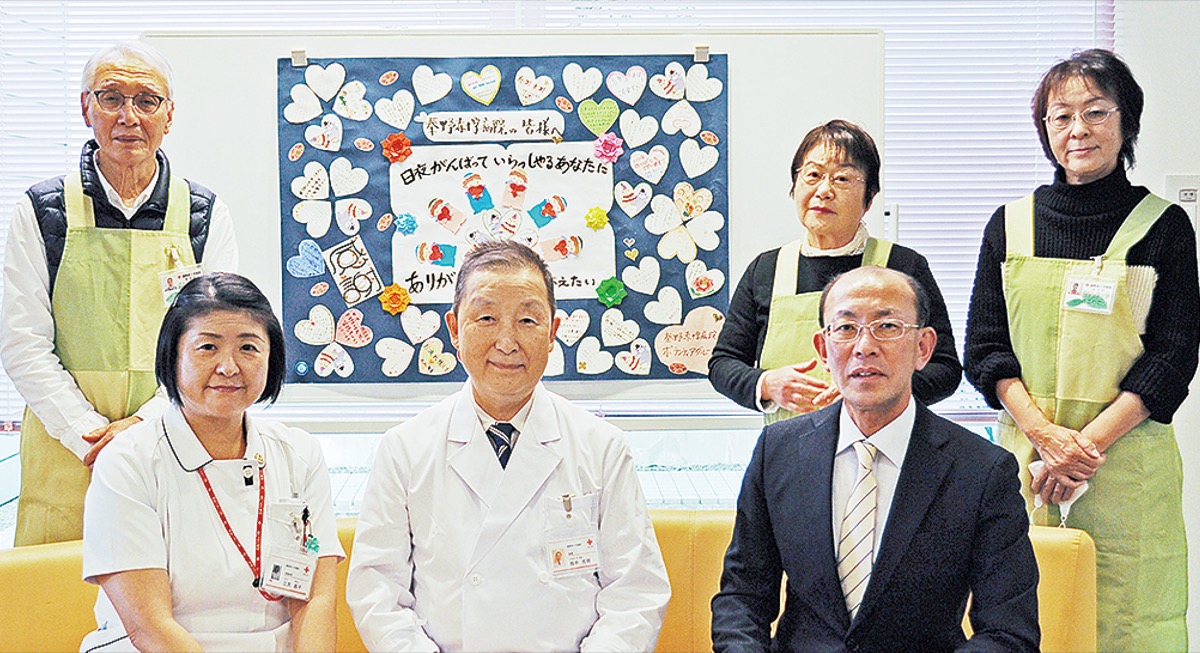 秦野赤十字病院ボランティアグループ(天野陽子代表)が12月22日、秦野赤十字病院の医療従事者に応援メッセージを贈った。同病院の田中克明院長と江尻昌子看護部長、柳田幸夫事務長が贈呈式に参加し、「励みになります」と感謝し受け取った。