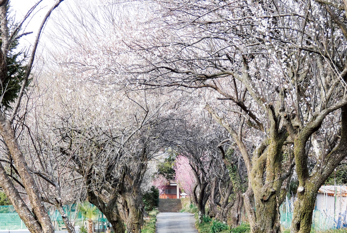 全長約200mの参道の脇に植えられた白梅が枝を伸ばし、満開時には白いトンネルのようになる香雲寺。毎年、香りを楽しみながらゆったりと観賞する人々で賑わっている。