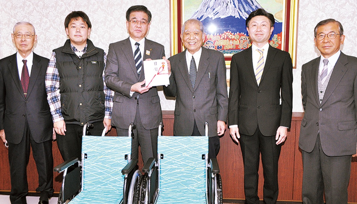 福祉有償運送業務や高齢者の交流サロンなどを運営する特定非営利活動法人ミライボランティア南の陶山富之理事長らが3月8日秦野市役所を訪れ、高橋昌和市長に法人設立を報告。併せて市に車いす2台を寄贈した。