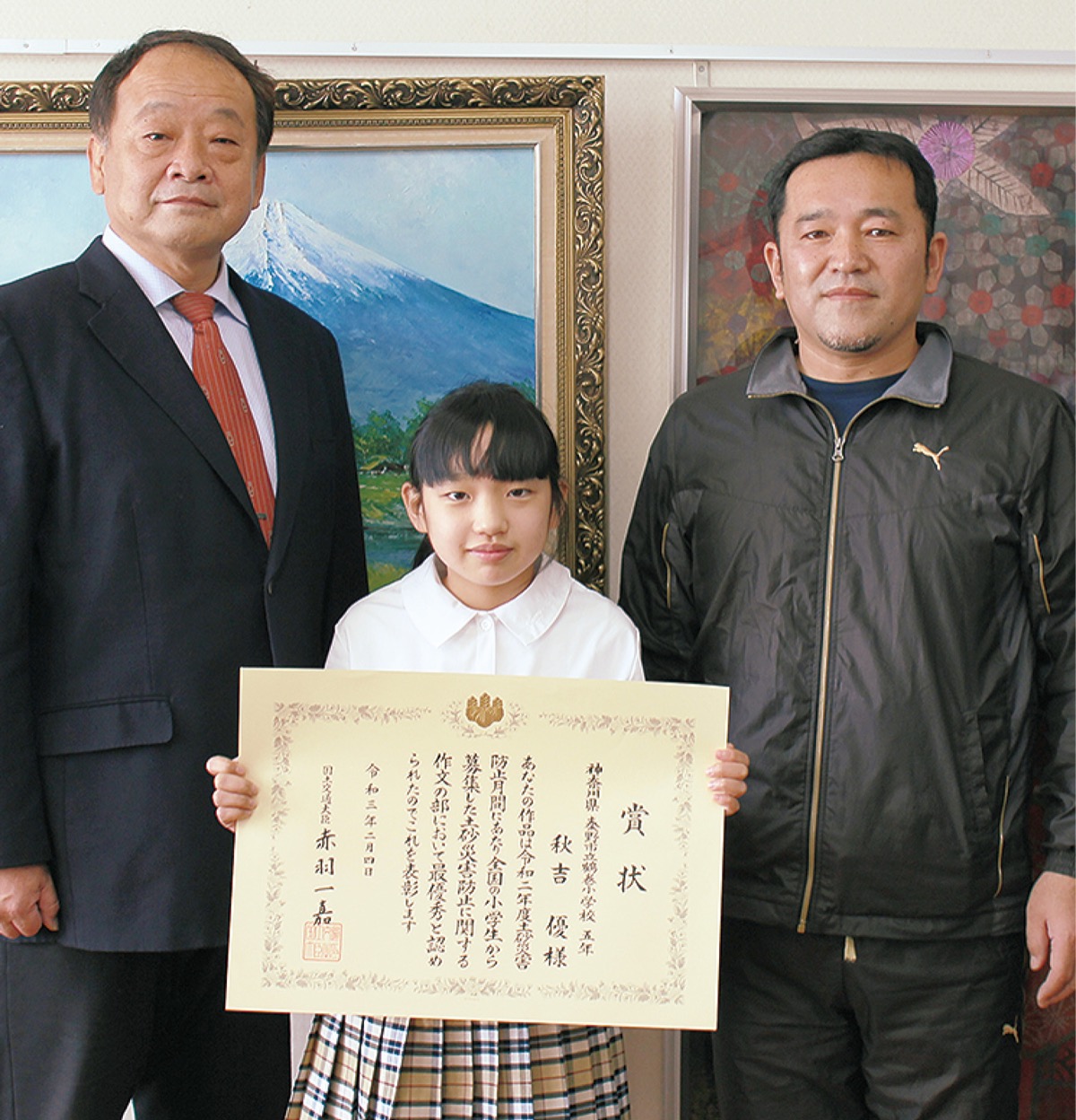 鶴巻小学校の秋吉優さん(5年)が2020年度「土砂災害防止に関する絵画・作文」コンクールの作文・小学生の部で最優秀賞にあたる国土交通大臣賞を受賞した。11日に同校で表彰伝達式があり、県砂防海岸課の千葉淳課長が秋吉さんに賞状を手渡した。