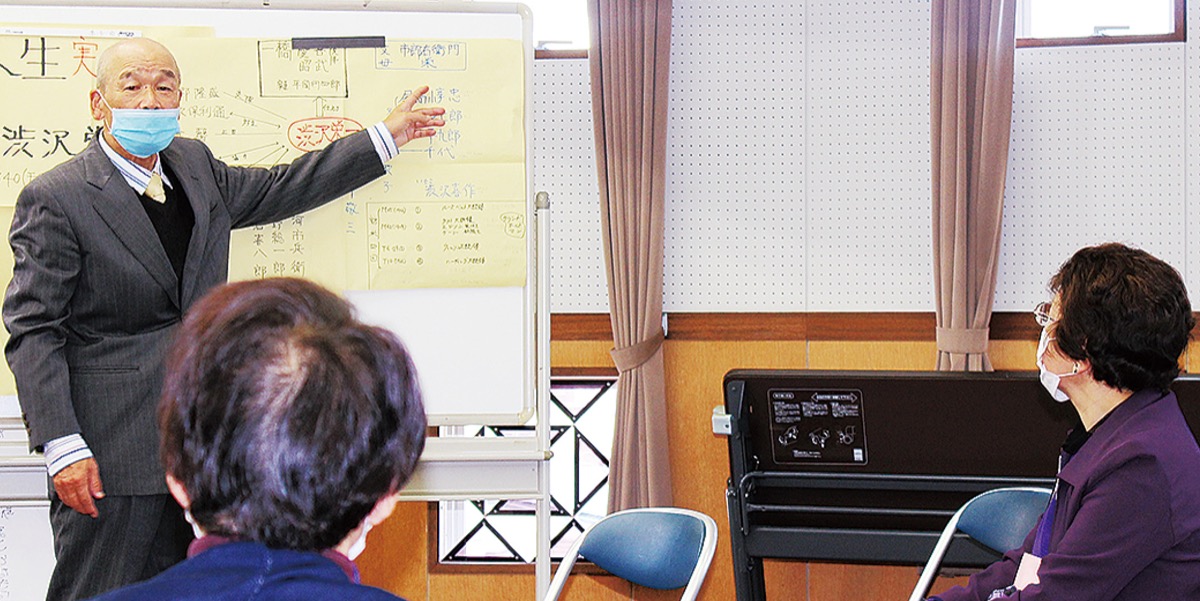 同サロンはシニア層を中心に毎月、健康体操や市の出前講座など生活に密着した内容を行っている。今回は現在放送中のNHK大河ドラマの主人公で、2024年度に刷新の1万円札の人物に決まった渋沢栄一をテーマに行われた。
