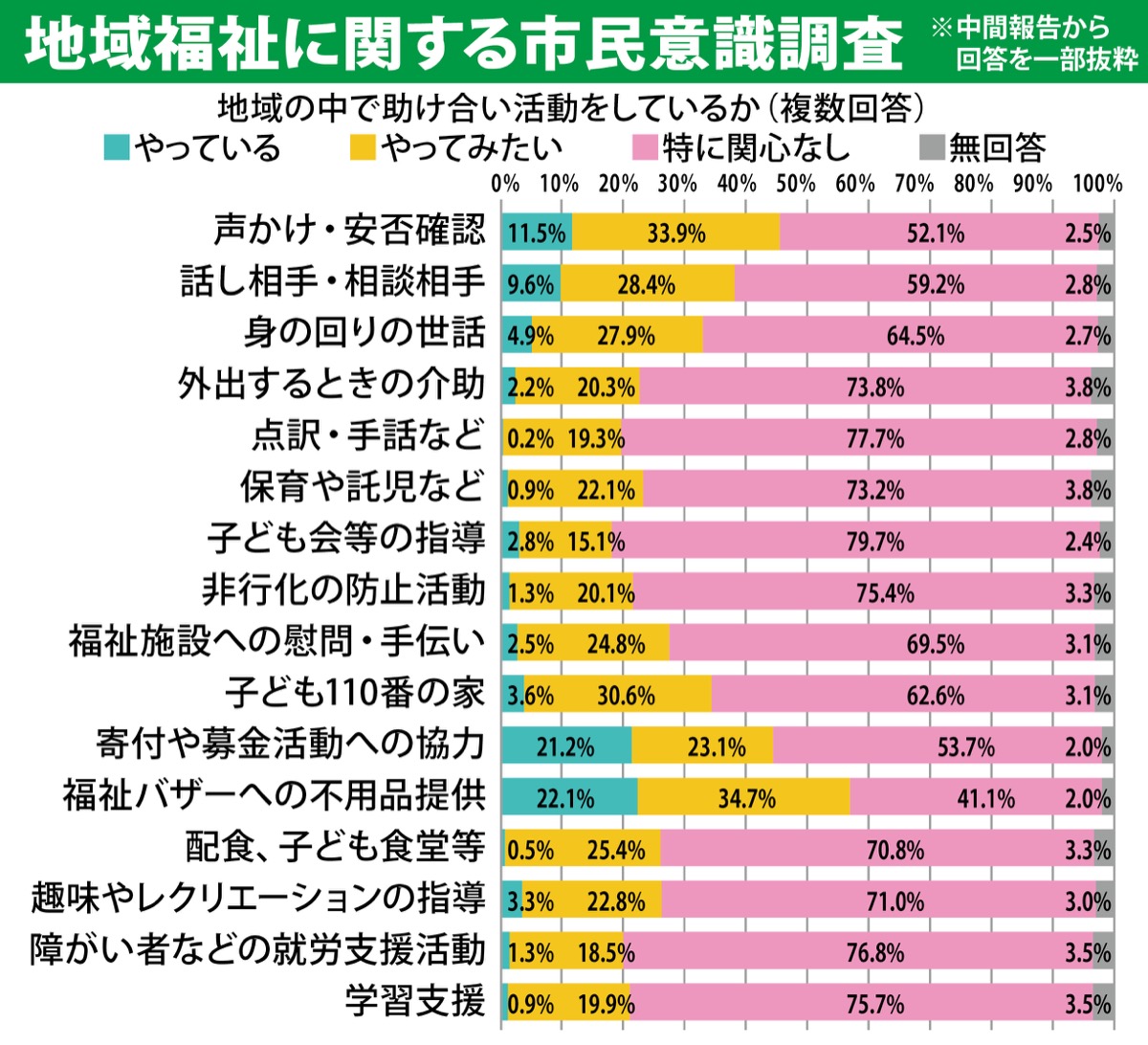 回答率は39・8%(回答数637件)。報告によると、助け合い活動をする上で必要な条件として「身近なところで出来ること」と回答した人が62・6%と最も多く、また「福祉活動に参加しない・できない理由」では「他人の生活に立ち入ることに戸惑いがある」が34・9%だった。コロナ禍で自身の態度や行動の変化についての設問では、「家族や近隣の人を今まで以上に気遣うようになった」と回答した人が71・3%だった。